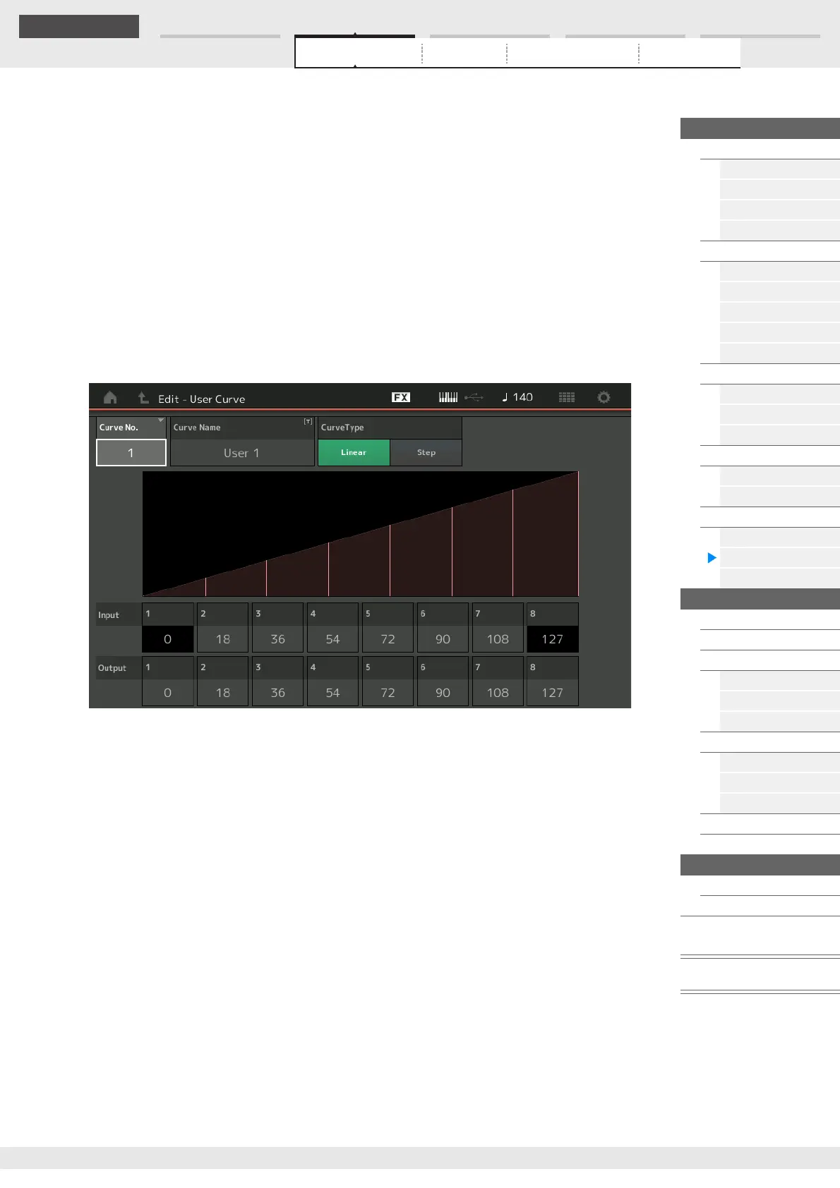 Determines the Input level of the Curve. “Input 1” is fixed to “0.” “Input 8” is fixed to 127 when the Curve