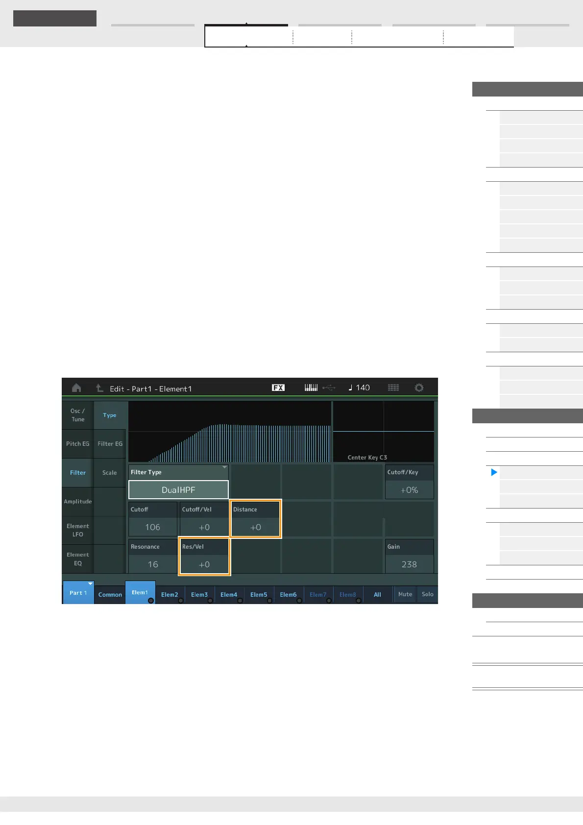 Yamaha MODX8 - Resonance; Cutoff;Key (Cutoff Key Follow Sensitivity); Center Key (Cutoff Key Follow Sensitivity Center Key); Res;Vel (Resonance Velocity Sensitivity)