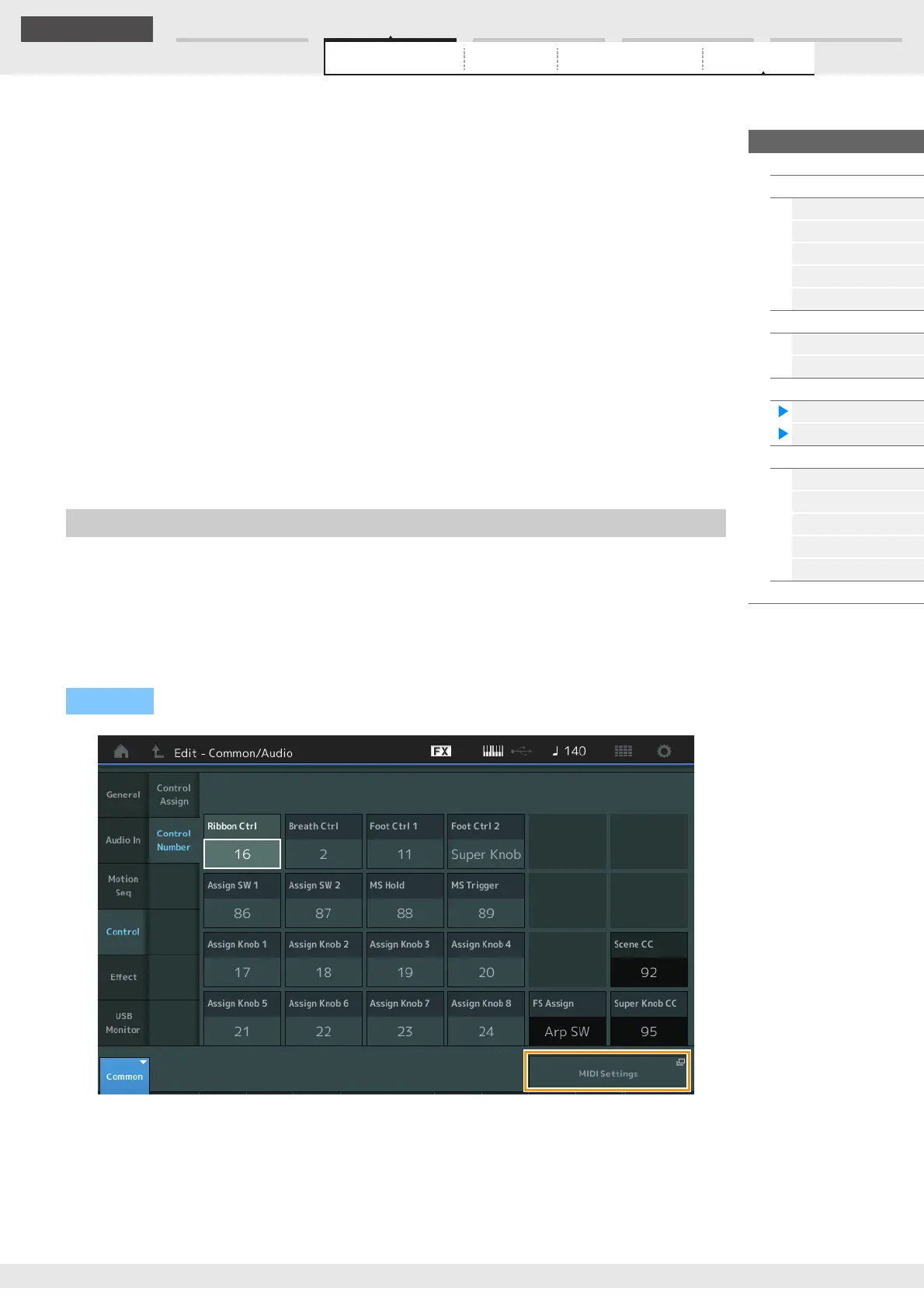 NOTE The Control Number set in this display is stored as Performance data. However, “FS Assign,” “Super Knob CC”