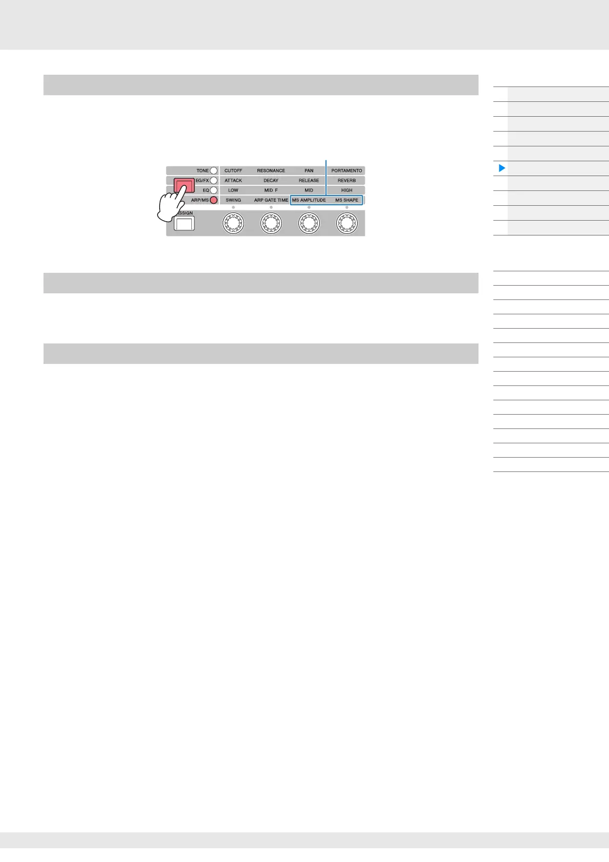 By pressing the Knob Function [TONE]/[EG/FX]/[EQ]/[ARP/MS] button and selecting “ARP/MS,” you can