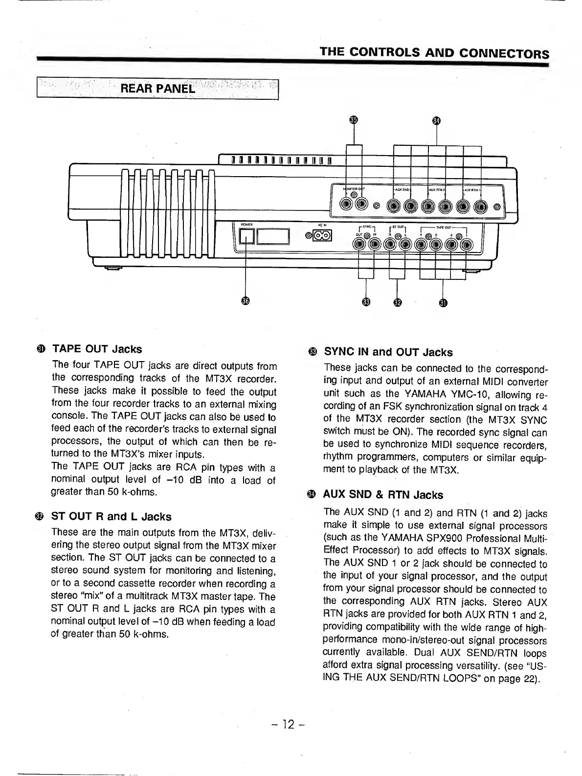 Yamaha MT3X - REAR PANEL CONNECTORS; Audio Output and Sync Jacks; Auxiliary Send;Return Jacks