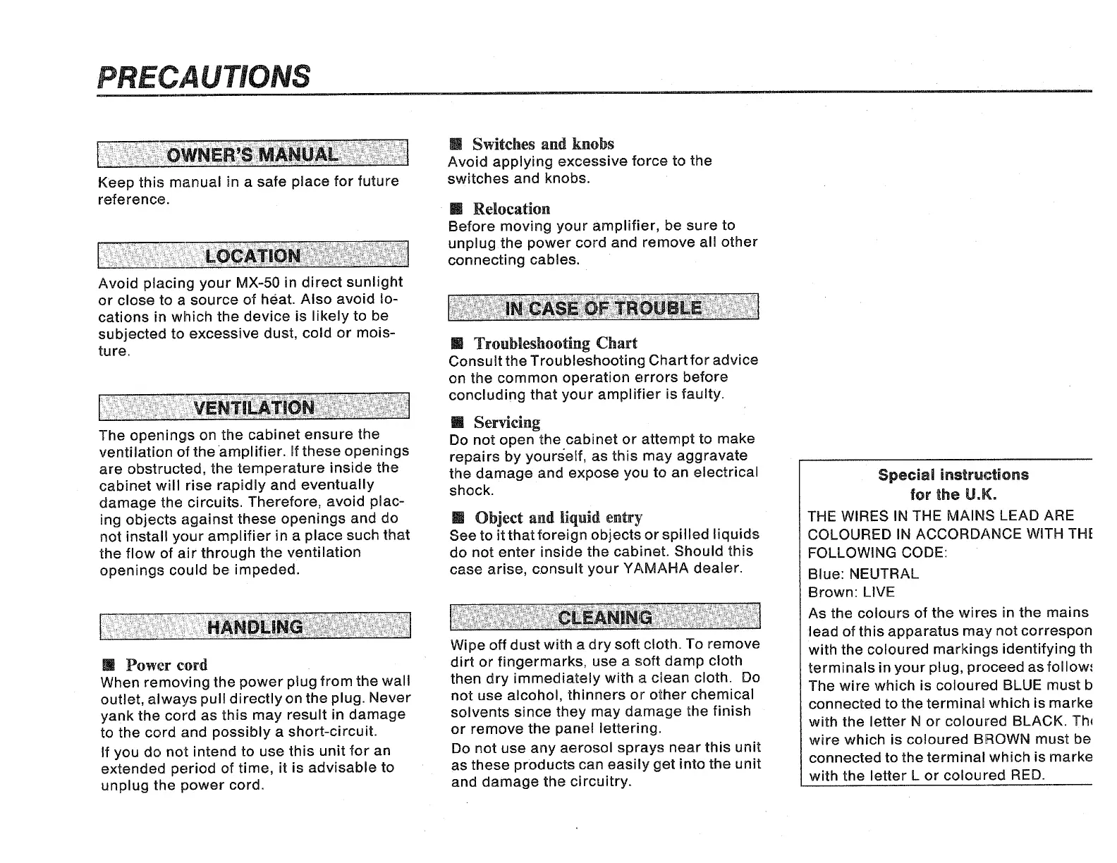 Yamaha MX-50 - Precautions and Safety; Location and Environmental Considerations; Ventilation and Airflow Management; Handling and Power Cord Safety
