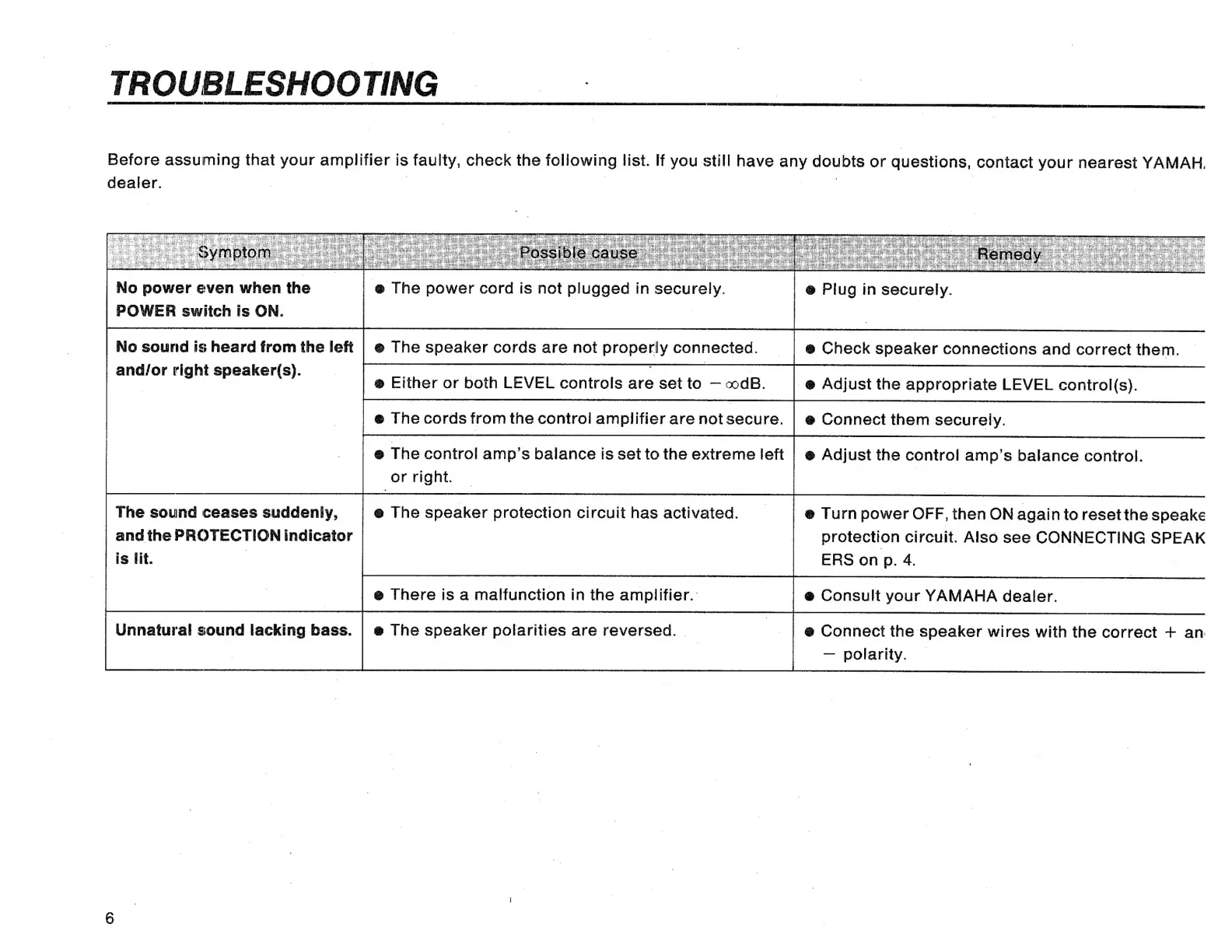 Yamaha MX-50 - Troubleshooting Common Issues; No Power or No Sound; Sound Ceases Suddenly; Protection Indicator; Unnatural Sound or Lack of Bass