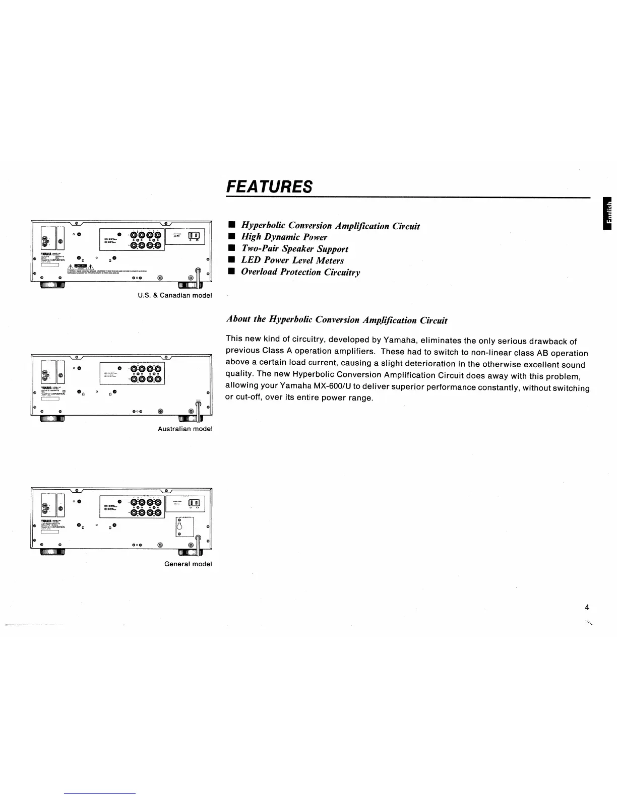 Yamaha MX-600 /U - Features; Hyperbolic Conversion Amplification Circuit; High Dynamic Power; Overload Protection Circuitry