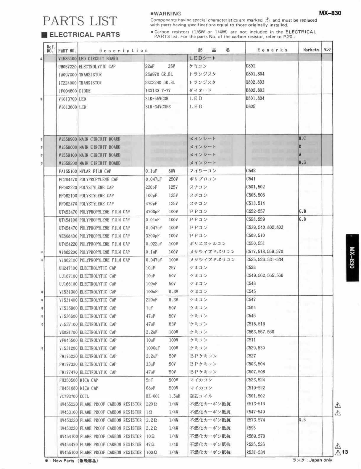Yamaha MX-830 - Electrical Parts List; Capacitors and Resistors; Transistors, Diodes, and LEDs; Other Electrical Components