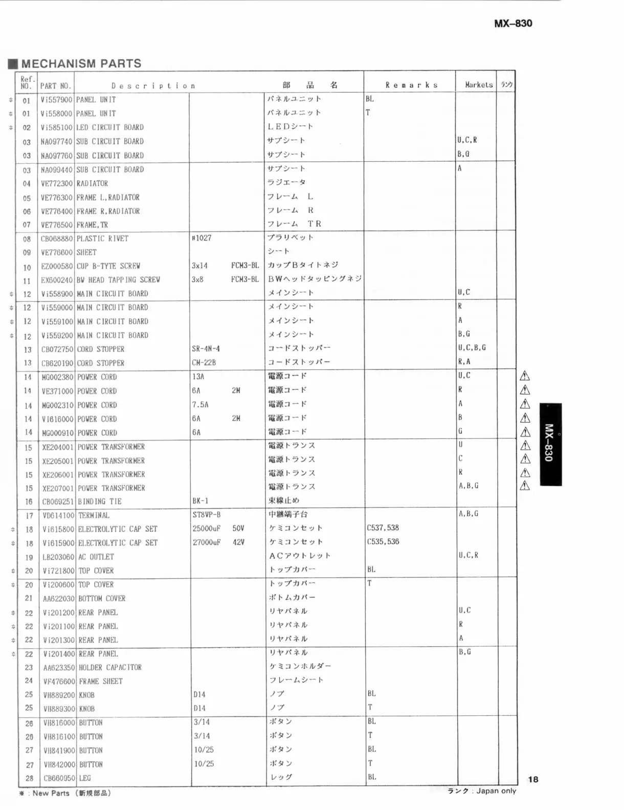 Yamaha MX-830 - Mechanism Parts; Panel and Frame Components; Power and Cord Components; Terminal and Connector Parts