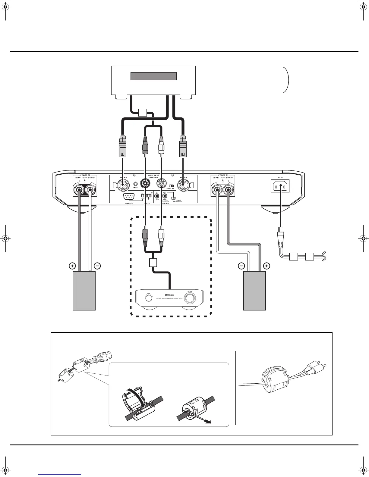 Be sure to attach the clamp filters to the power cable and the audio pin cable as illustrated below.