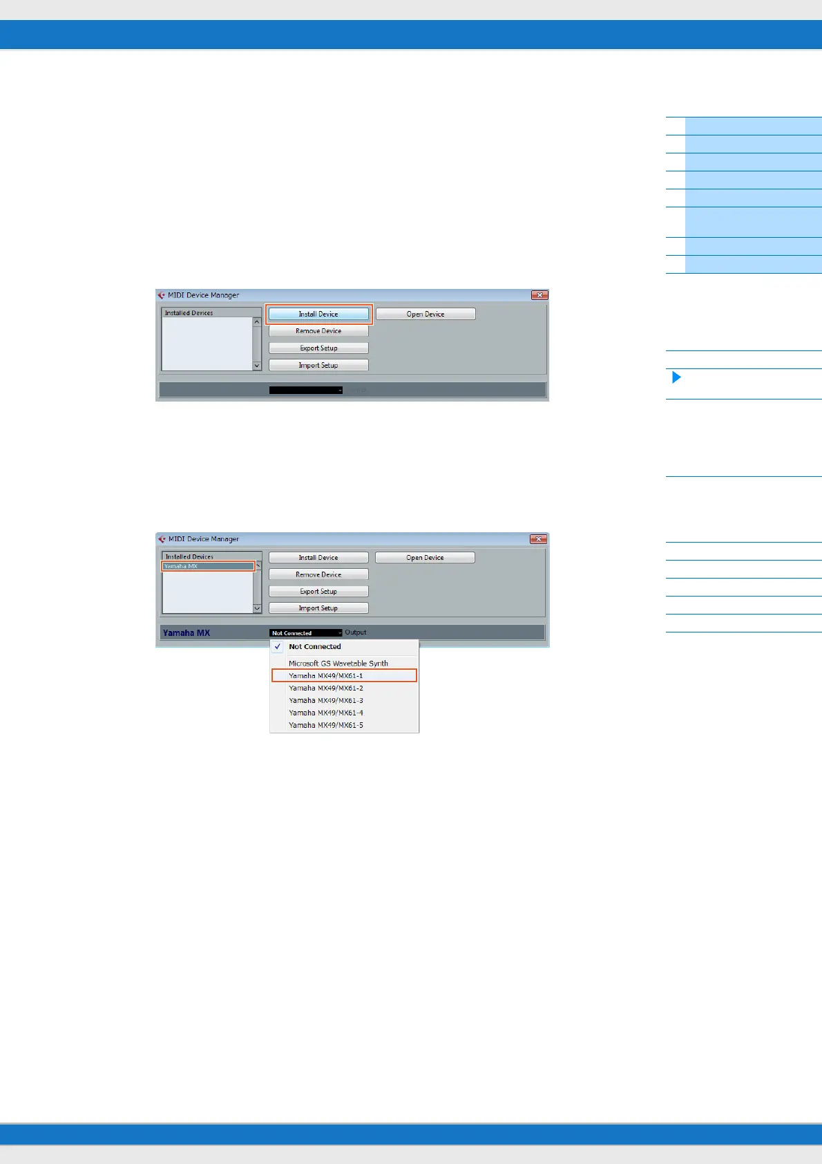 5-3 After selecting “Yamaha MX” in the “Installed Devices” area on the MIDI Device Manager