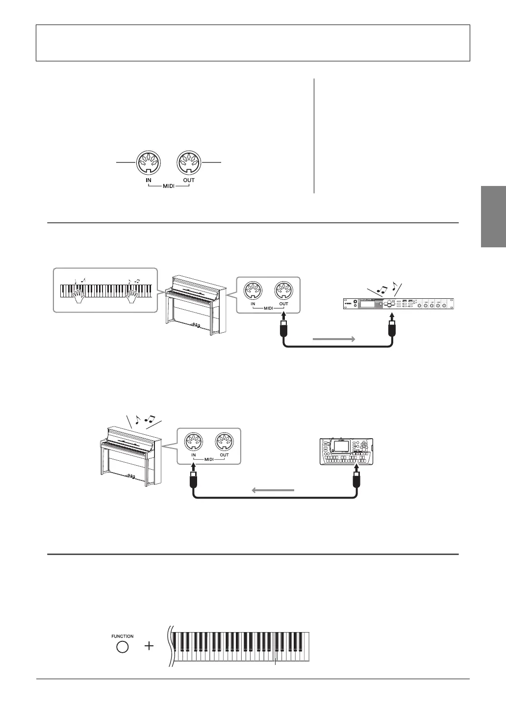 The connection below allows you to play the sounds of an external MIDI tone generator from the keyboard of this