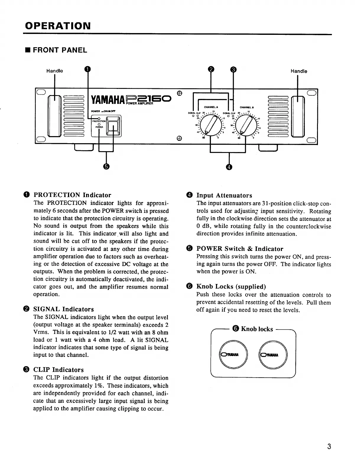 Yamaha P2160 - Front Panel Operation; Indicators: Protection, Signal, Clipping; Power Switch and Indicator; Input Controls