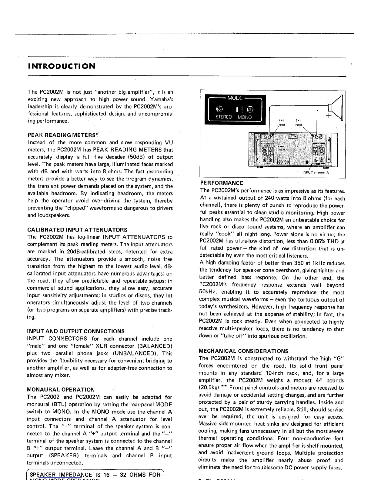 Yamaha PC2002 - Introduction to the PC2002 M; Peak Reading Meters; Calibrated Input Attenuators; Input and Output Connections