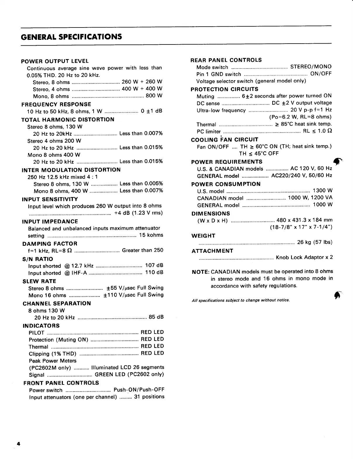 Yamaha PC2602 - General Specifications; Power Output and Frequency Response; Distortion and Input Characteristics; Damping Factor and Slew Rate