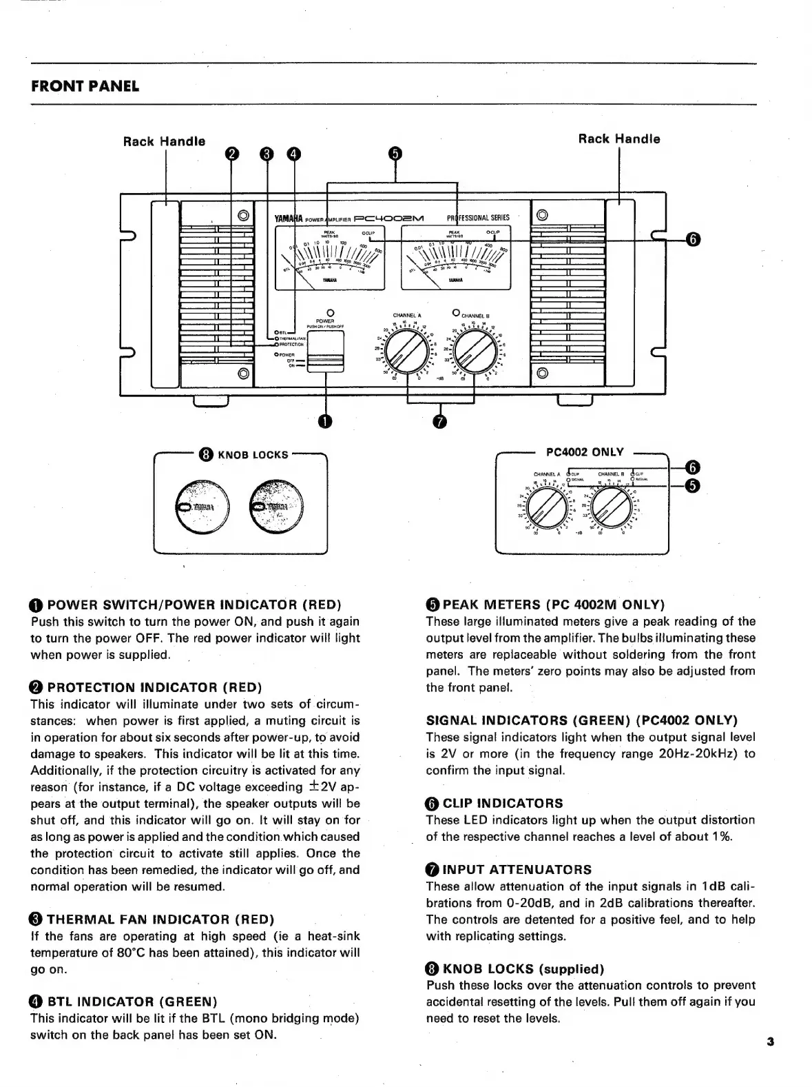 Yamaha PC4002 - Front Panel; Power Switch;Power Indicator (RED); Protection Indicator (RED); Thermal Fan Indicator (RED)