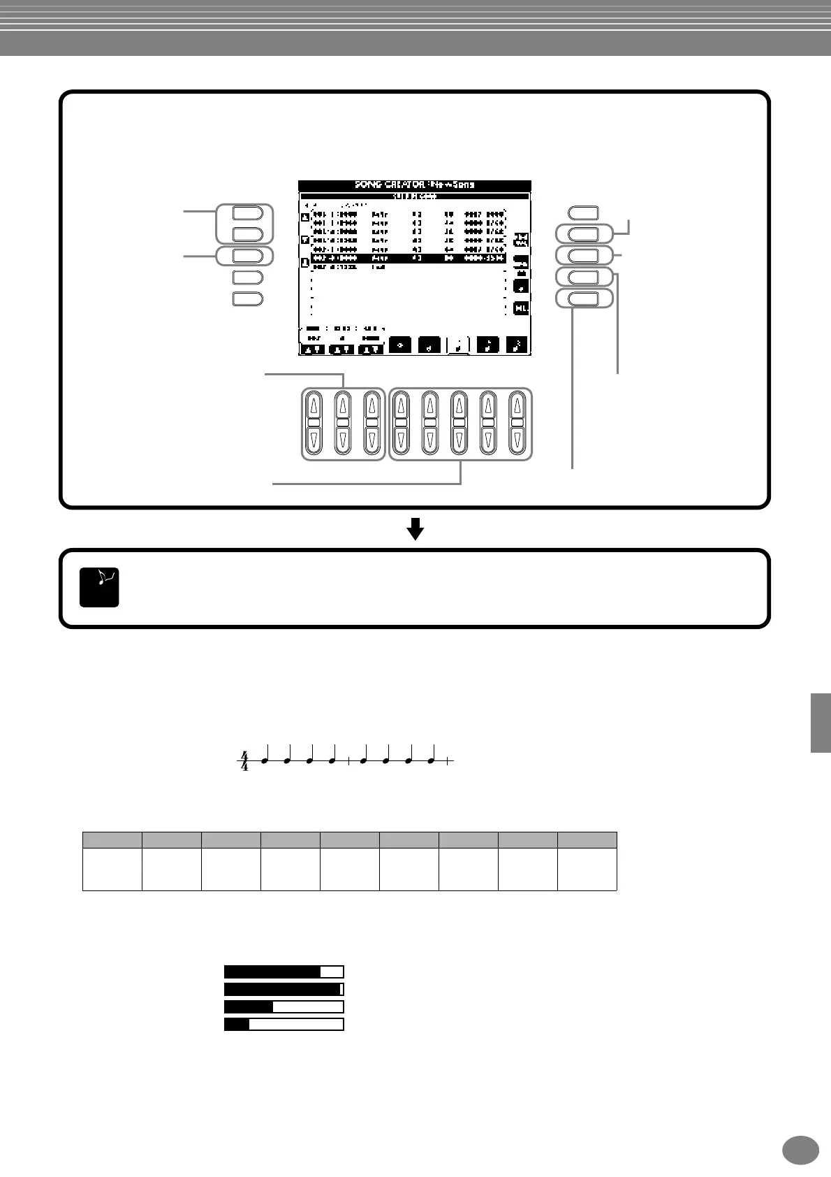 First, select the desired voice. To enter the note, first specify the length and loudness in this display,