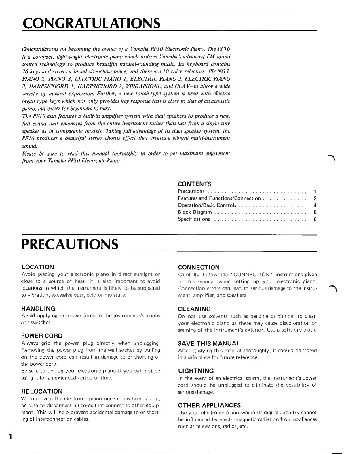 Yamaha pf10 - Precautions