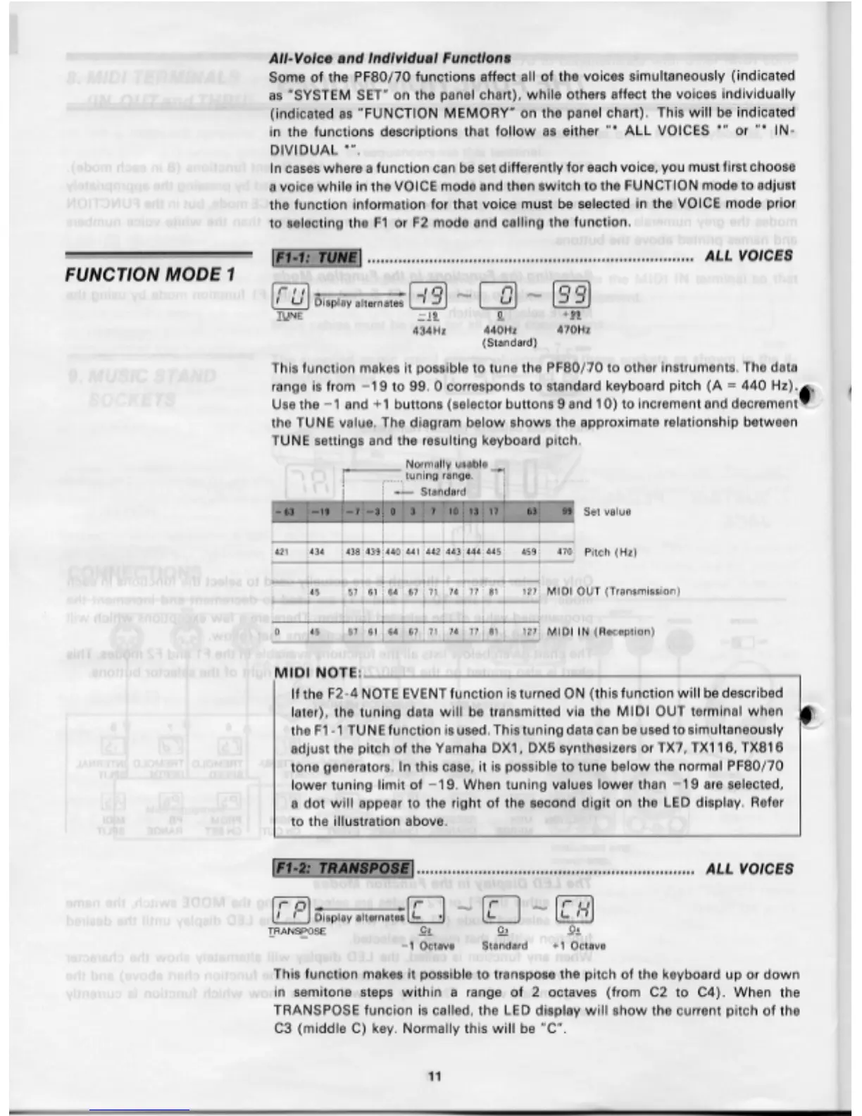 Yamaha PF80 - Function Mode 1; F1-1: Tune; F1-2: Transpose