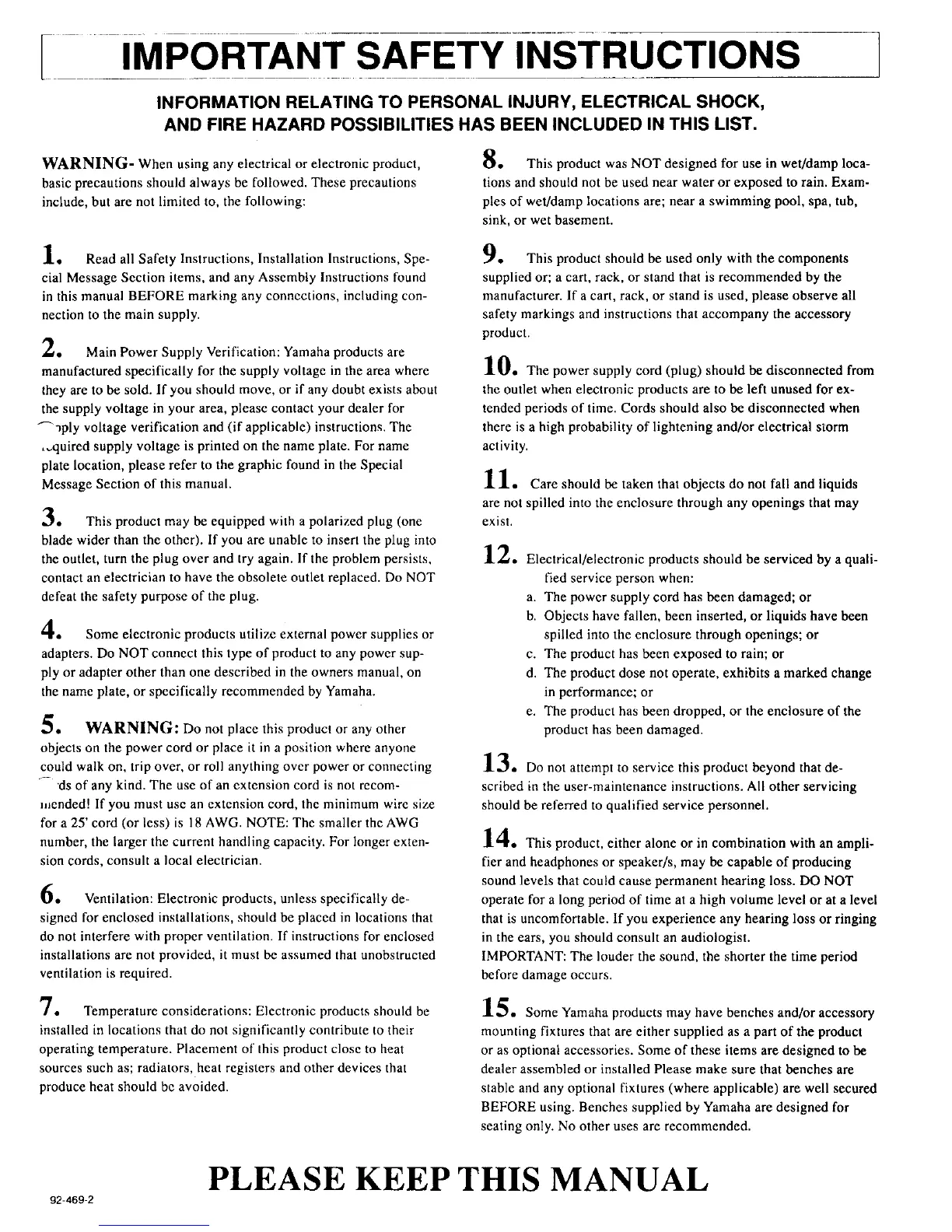 Yamaha PF85 - Important Safety Instructions; General Safety Precautions; Electrical Safety and Usage Guidelines; Servicing and Hearing Protection