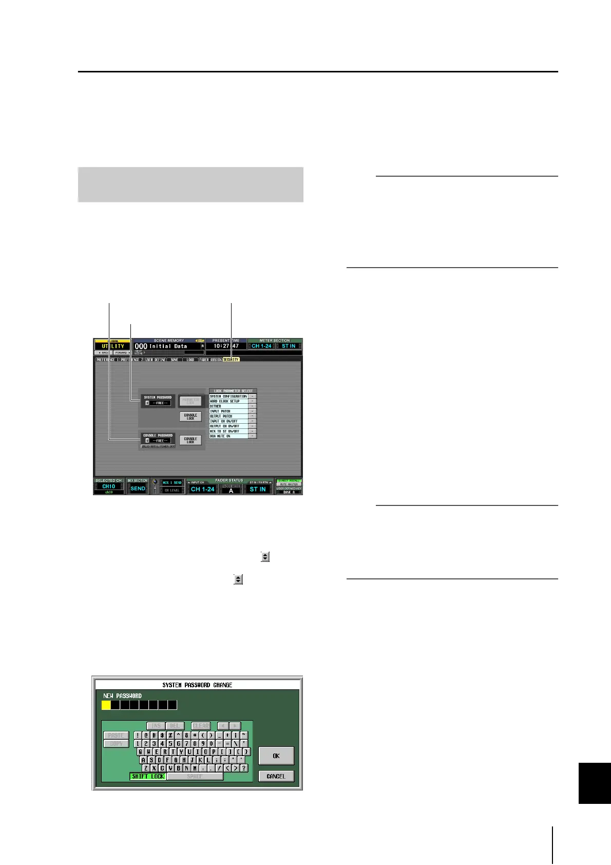 The PM5D lets you prohibit changes to certain parameters (Parameter Lock), or prohibit operation of the console (Console