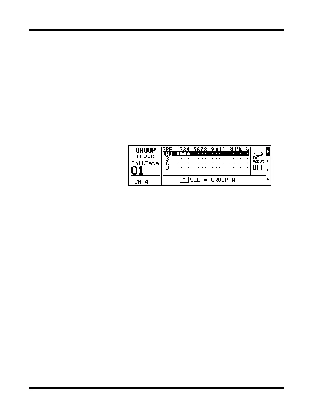Shown below is the FADER GROUP LCD function. Channel num-