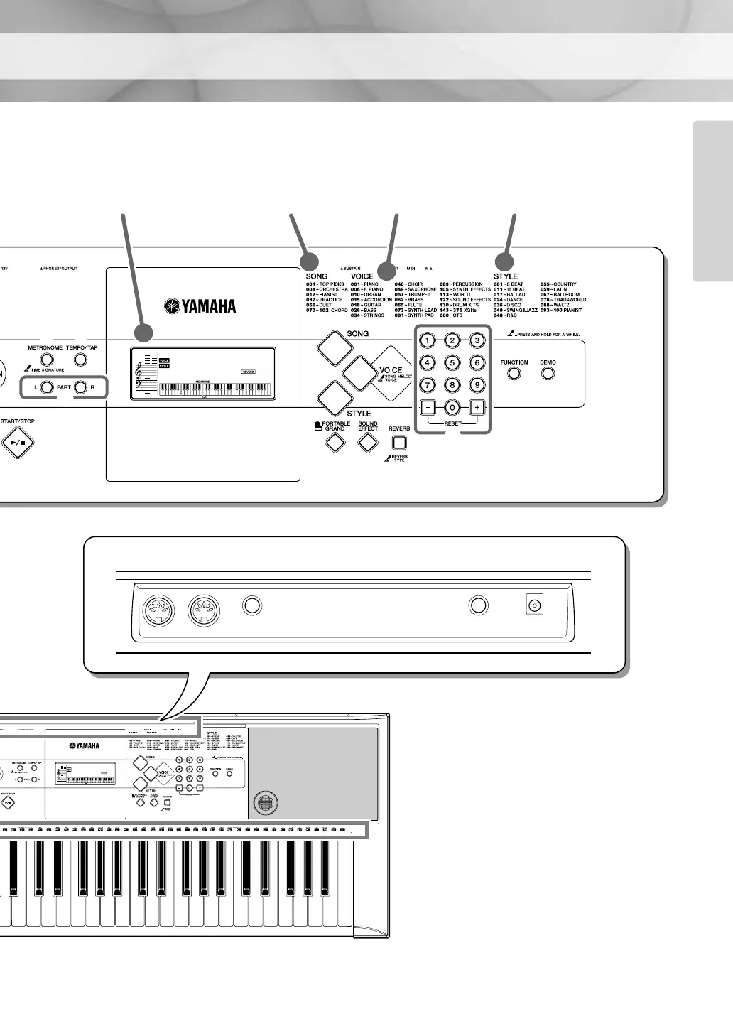 Voice List (page 48) Style List (page 54)Display (page 27) Song List (page 55)