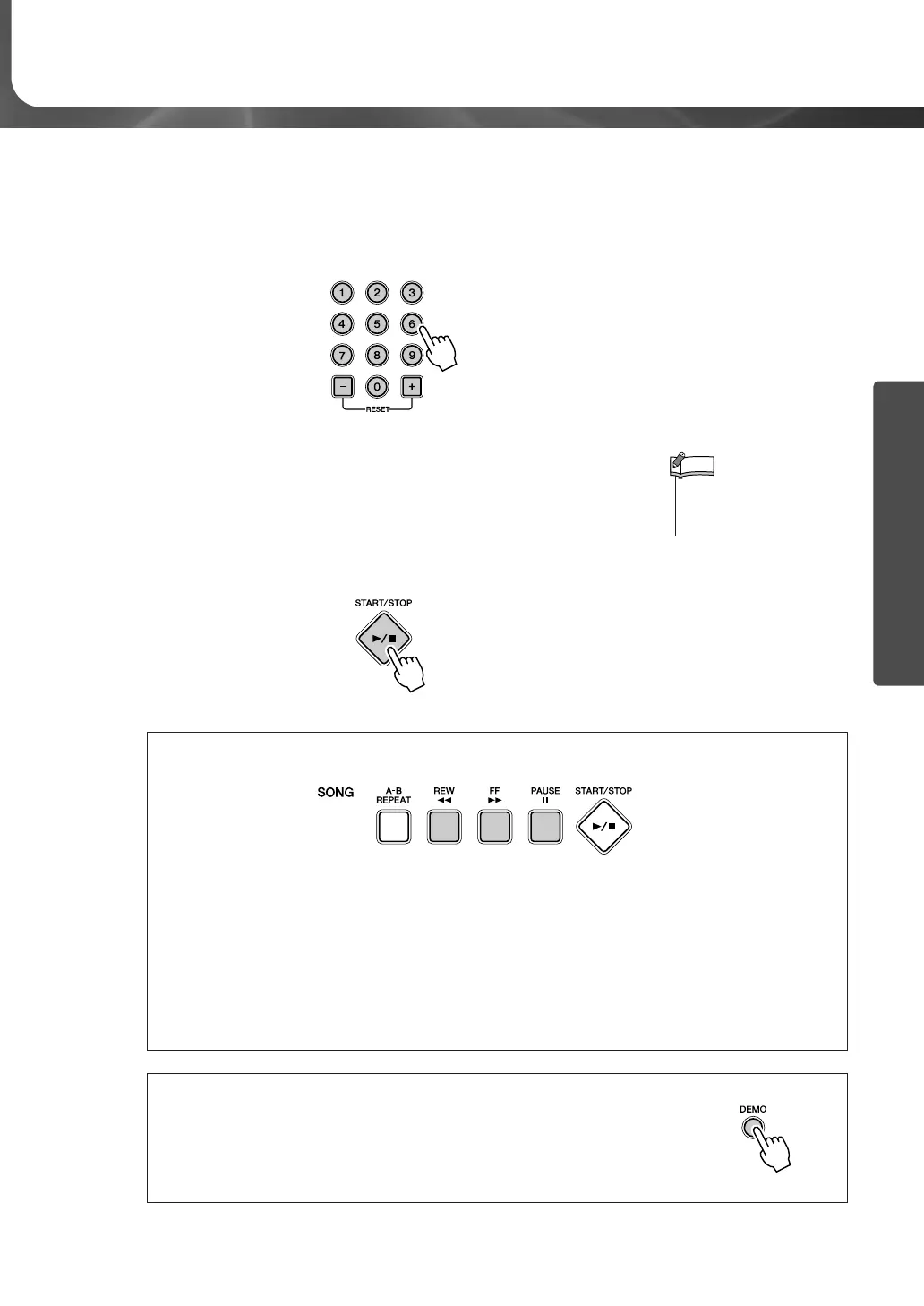 Press the [DEMO] button to play Songs 001, 002, 003, 059, 072, 004, 024,