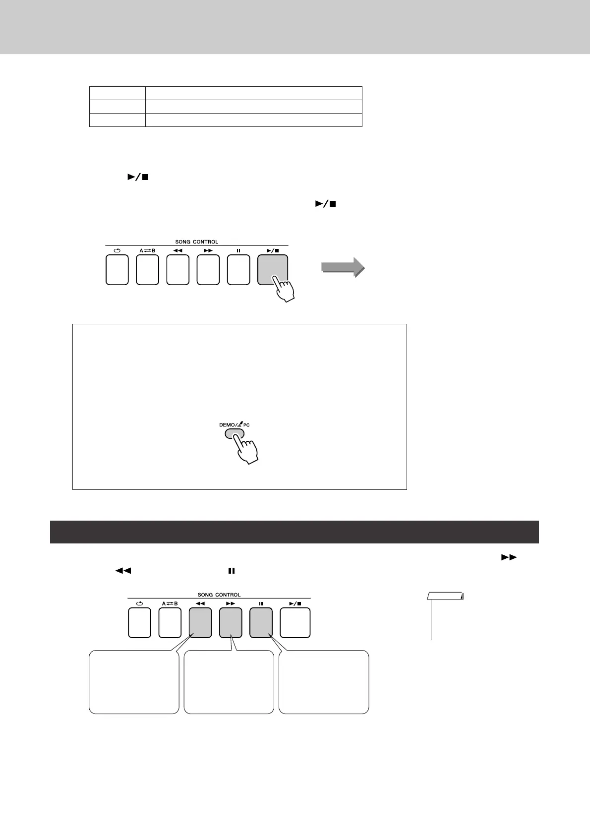 Press the [DEMO/PC] button to play Songs 001–008 in sequence. Playback