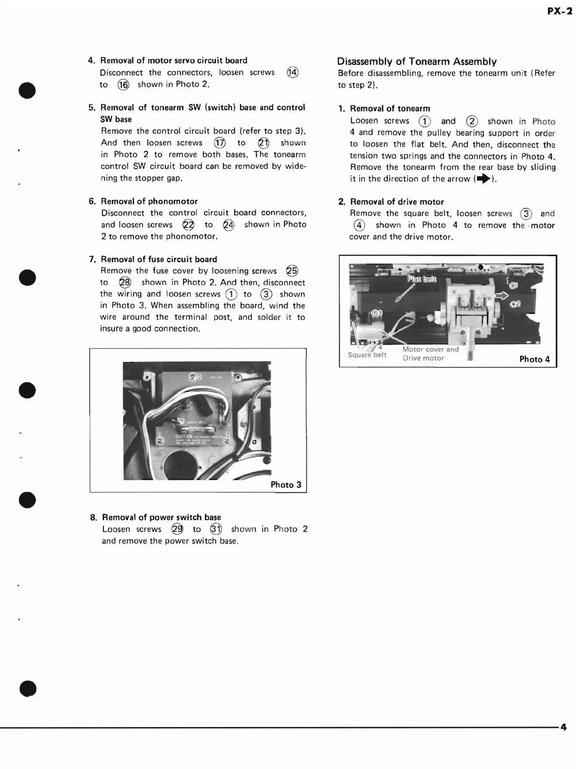 Yamaha PX-2 - Component Board Removals; Disassembly of Tonearm Assembly; Tonearm Removal; Drive Motor Removal