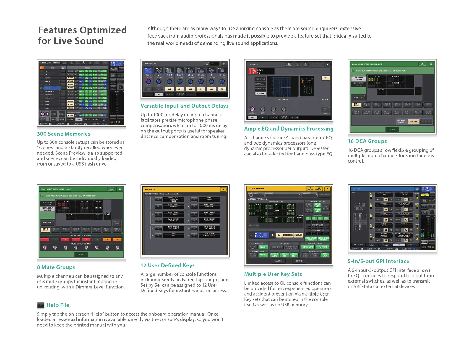 Yamaha QL Series - Features Optimized for Live Sound; 300 Scene Memories; Versatile Input and Output Delays; Ample EQ and Dynamics Processing