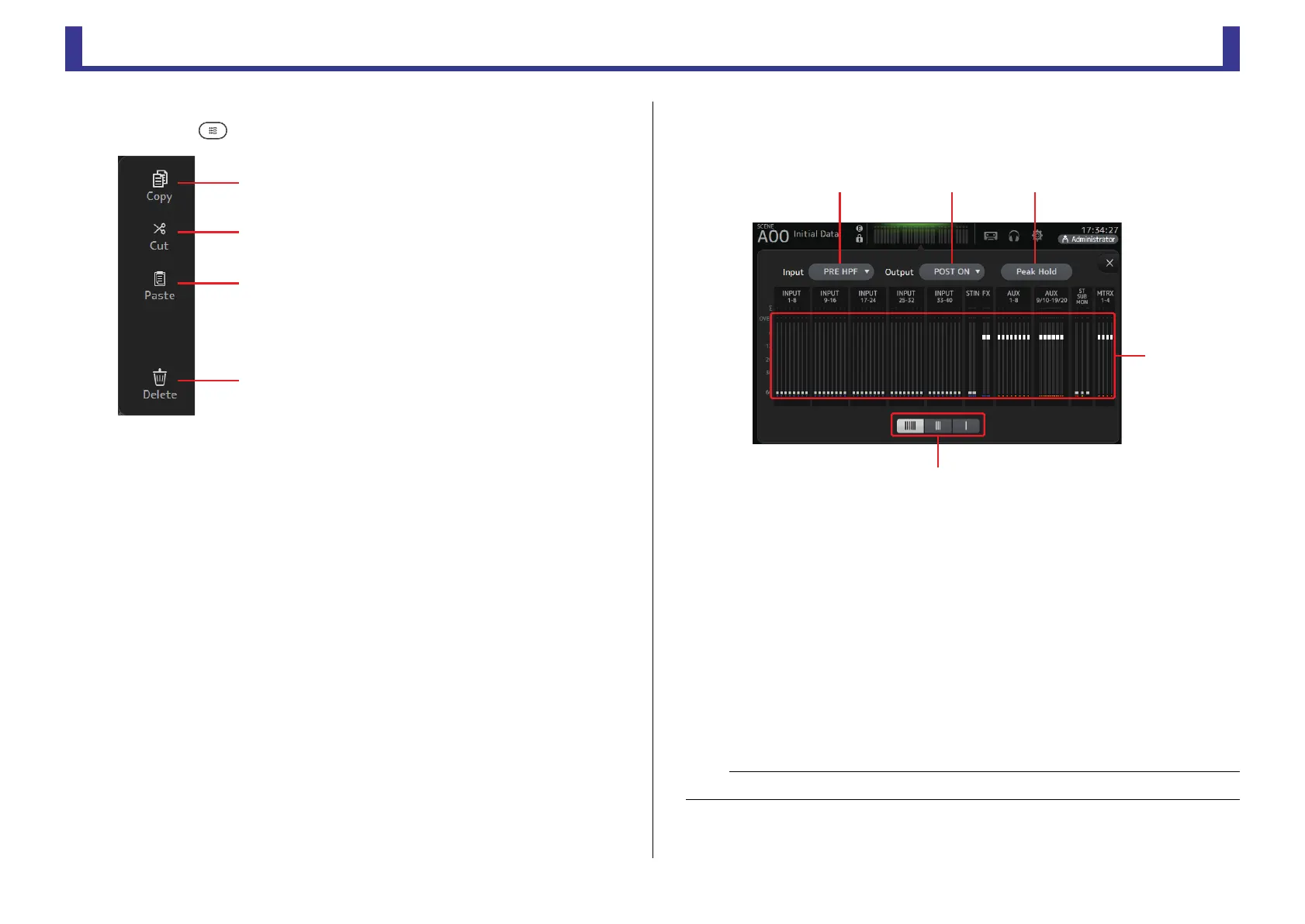 Displays the input and output level of all the channels, and allows you to select the metering