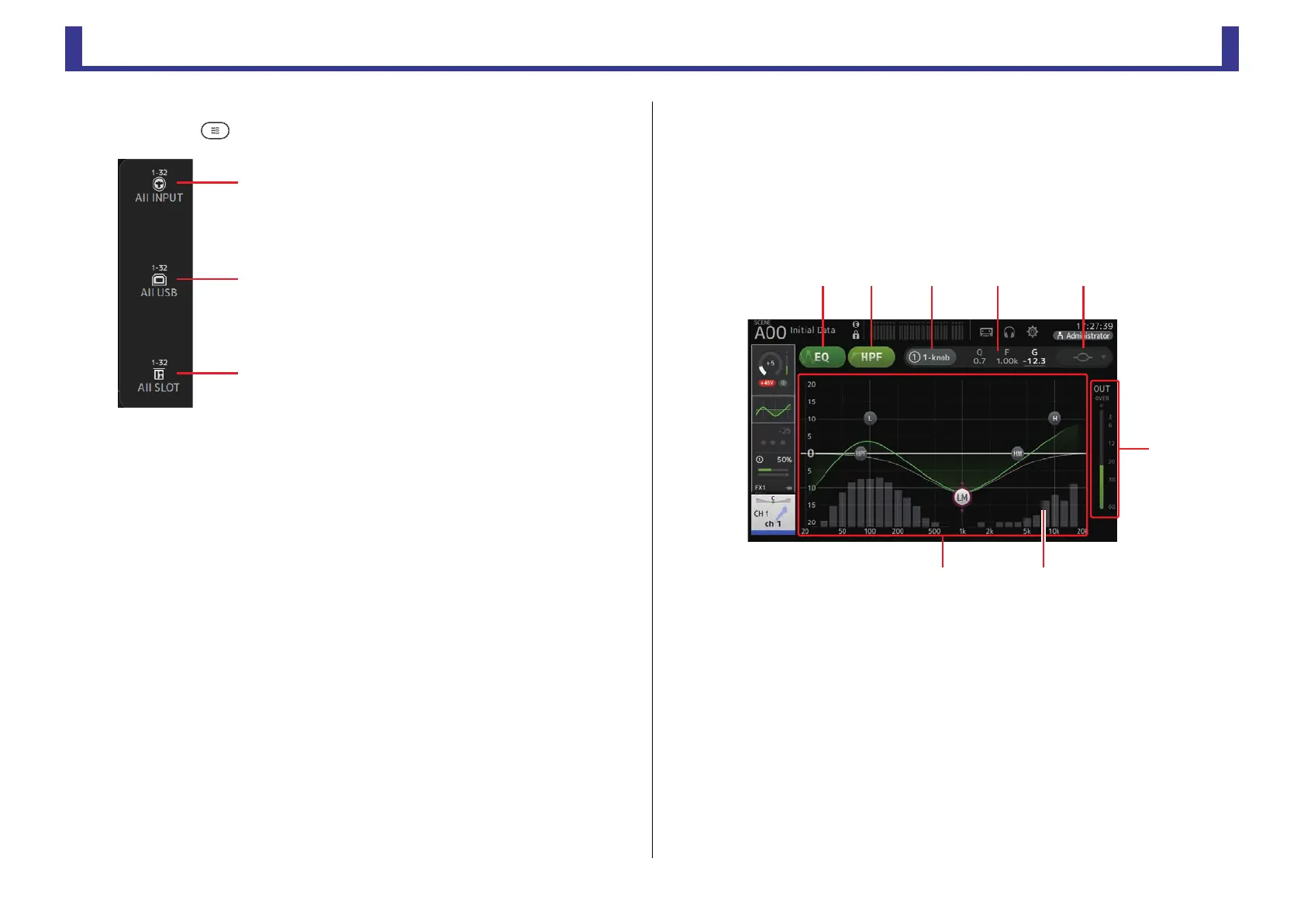 Controls the EQ for each channel. 4-band parametric EQ is available for CH 1–32, AUX 1–20,