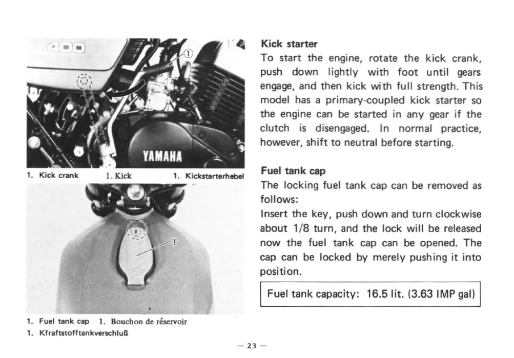 Fuel tank capacity: 16.5 lit. (3.63 IMP gal)