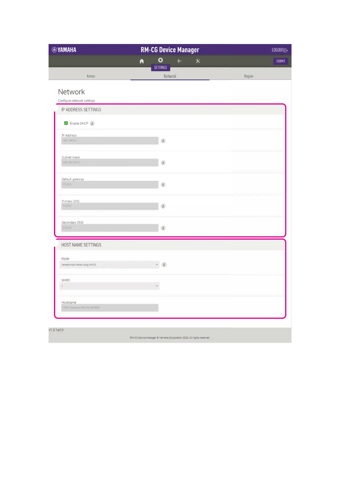 Yamaha RM-CG - Device Manager Network Settings; IP Address and Host Name Settings