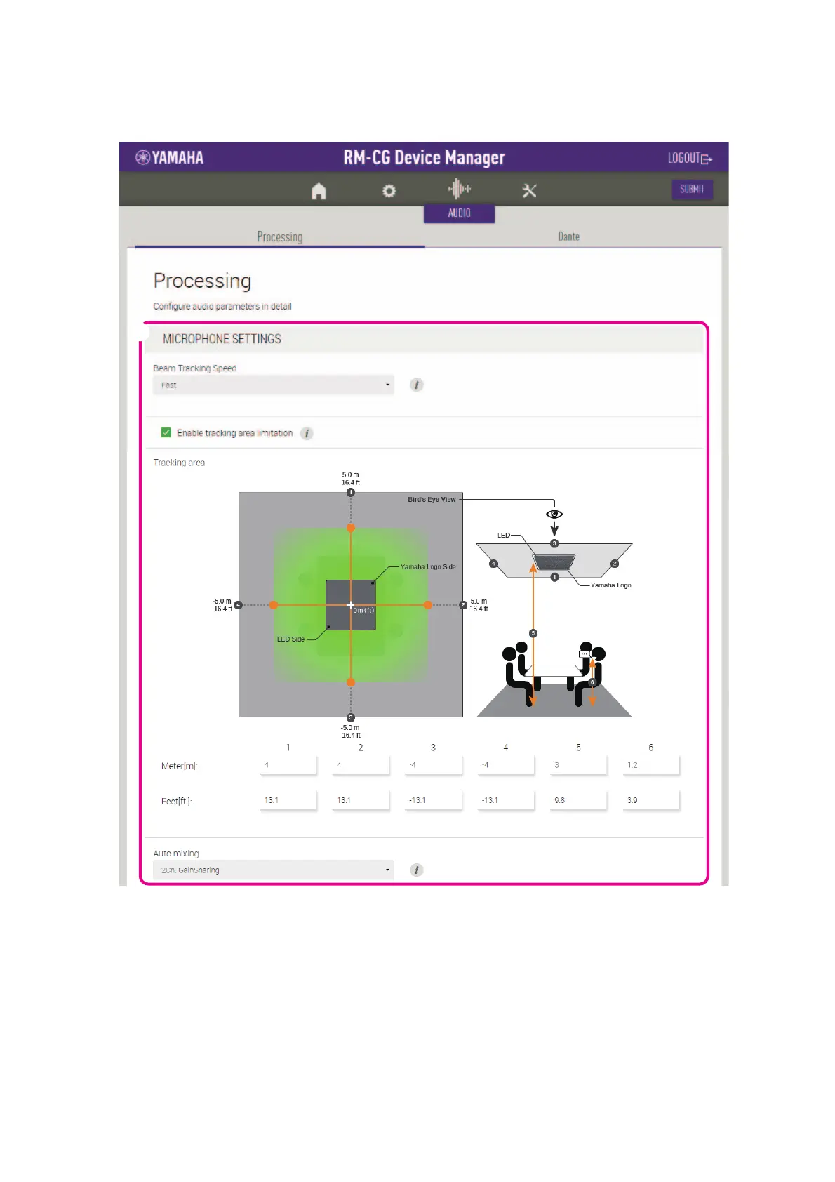 Yamaha RM-CG - Audio Processing and Dante Configuration; Microphone Settings