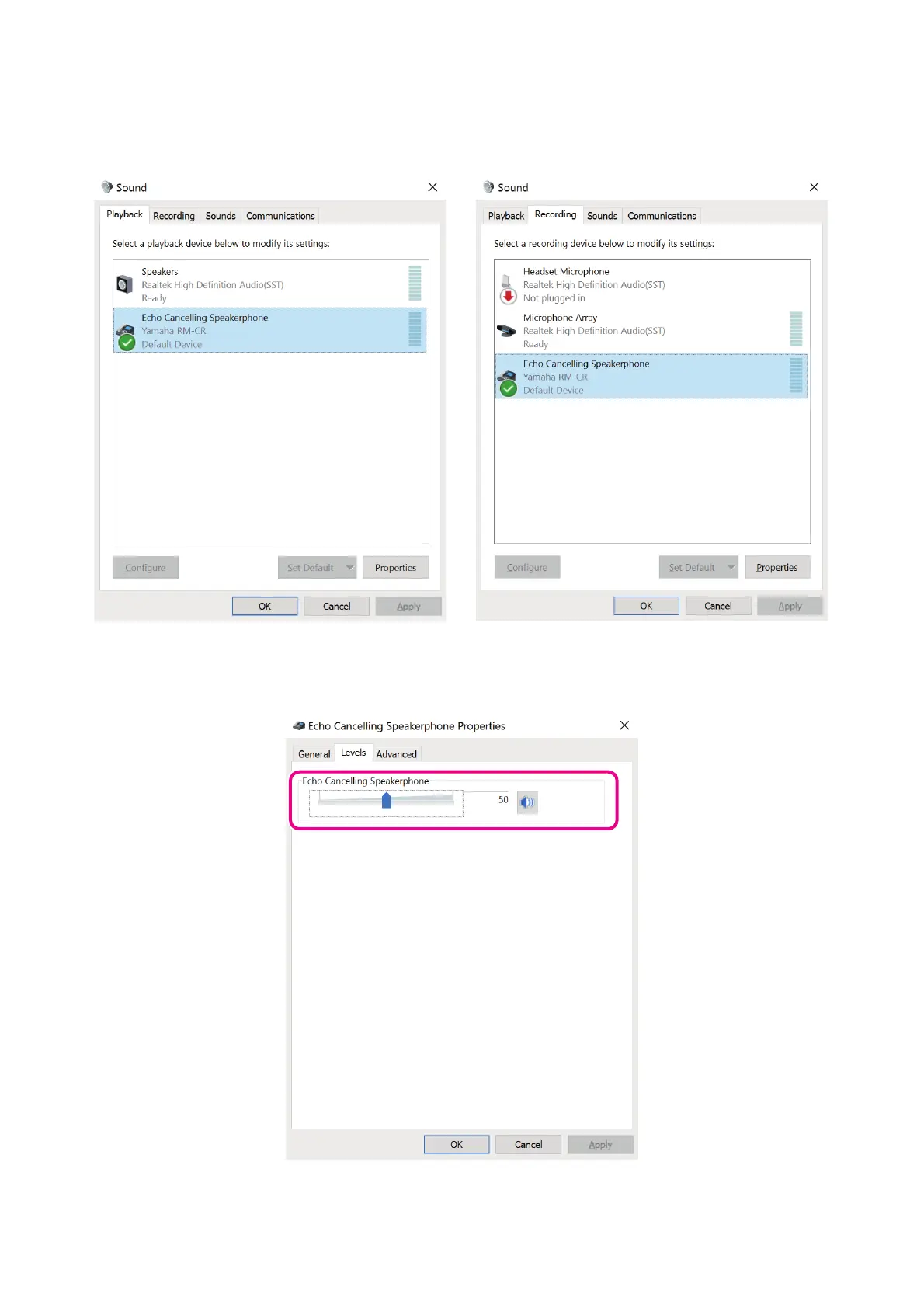 then click [Properties] to open the [Echo Cancelling Speakerphone Properties] window. Click the [Levels] tab to