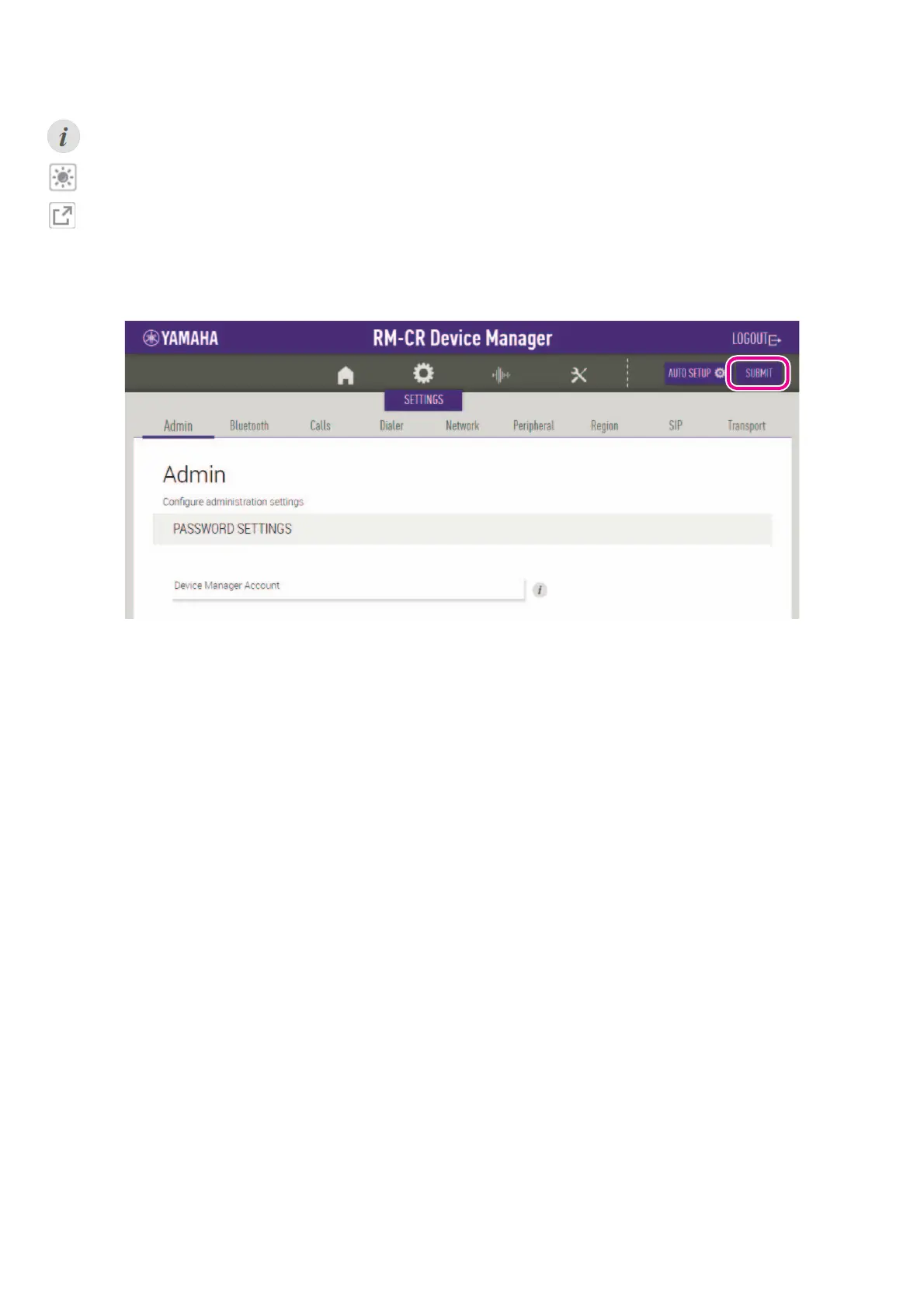IMPORTANT: Be sure to click the [SUBMIT] button after changing settings in RM-CR Device Manager. The [SUBMIT] button always