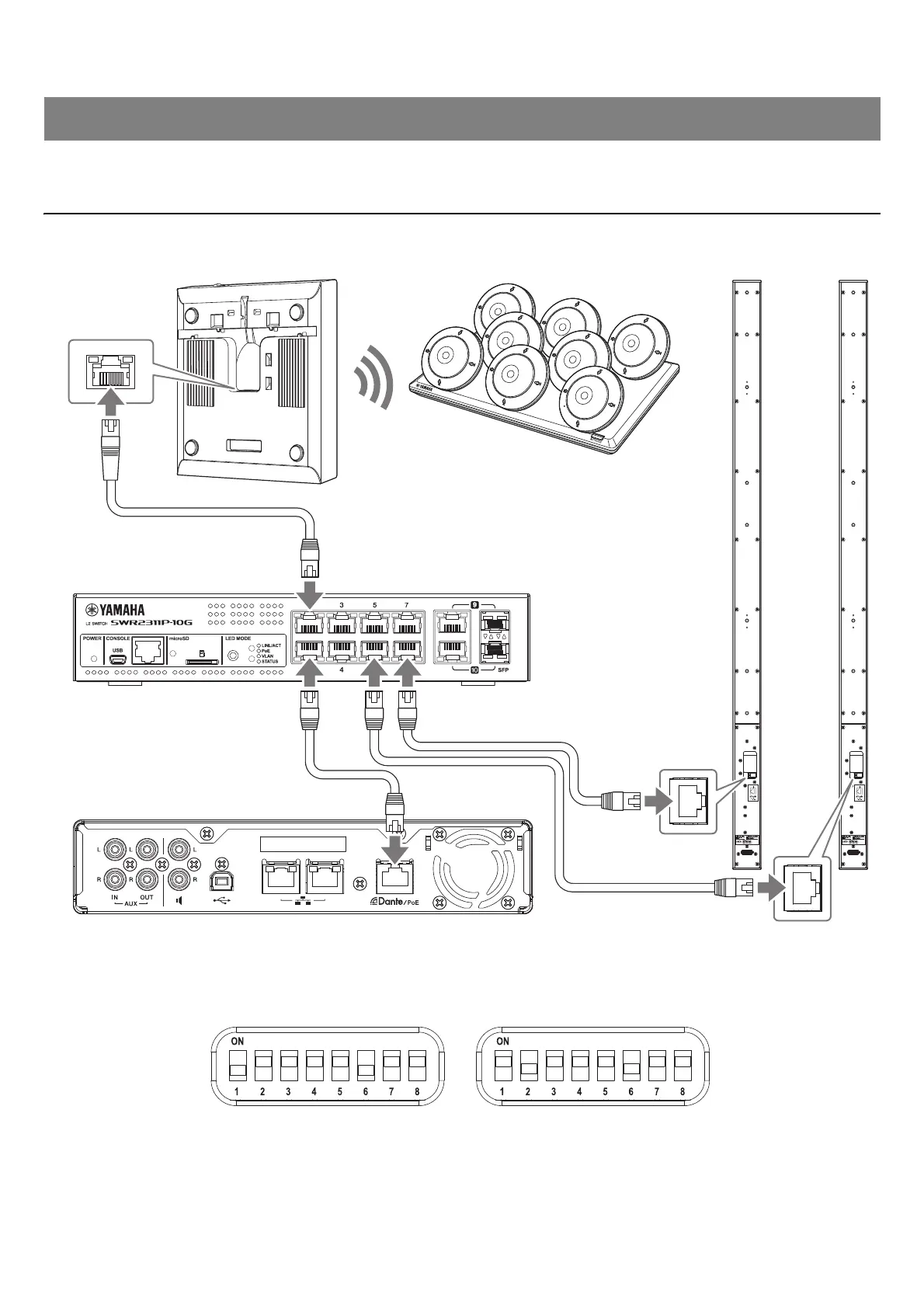 IMPORTANT: There is a DIP switch for specifying settings on the back of each VXL1-16P. Before plugging in LAN cables, set the