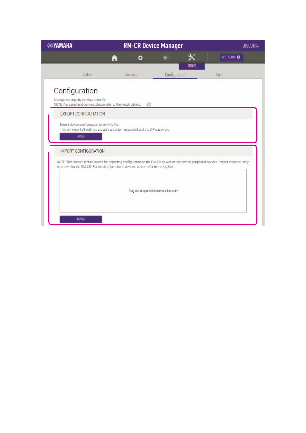 Allows you to import settings into this unit by dragging and dropping the settings file into the box, then clicking the [IMPORT] button.