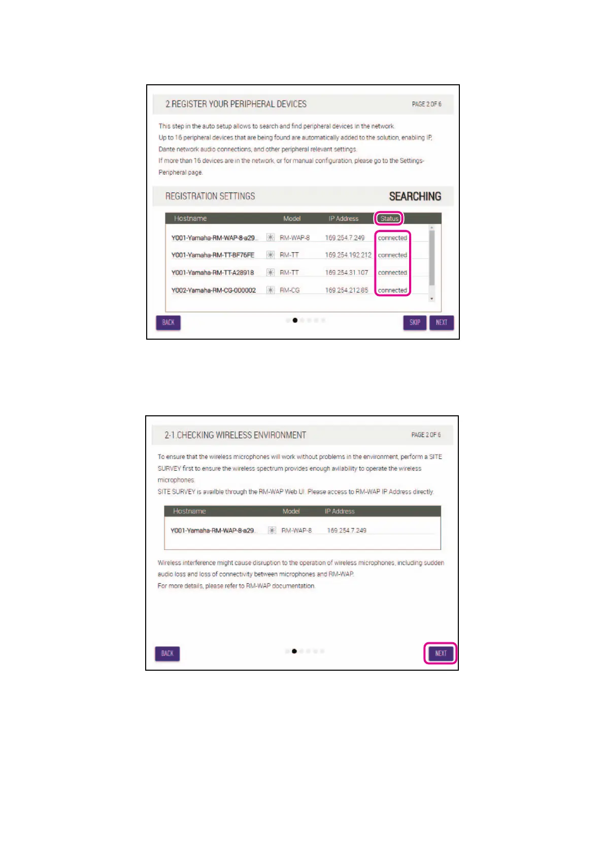 2 Check that [connected] appears below [Status] for all peripheral devices, and then click the [NEXT] button.