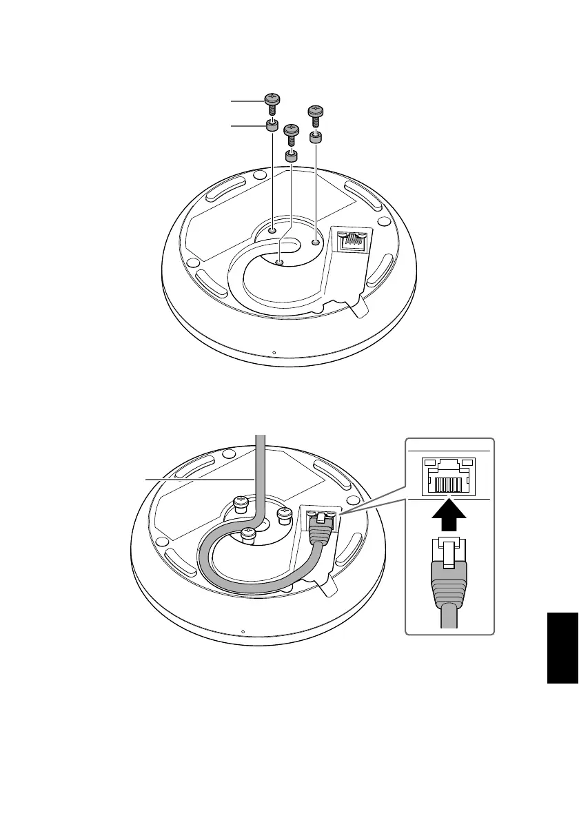 3. 기기 밑면에서 캡을 제거한 다음 장착 구멍을 통해 장착 나사 3개를 설치합니다 .