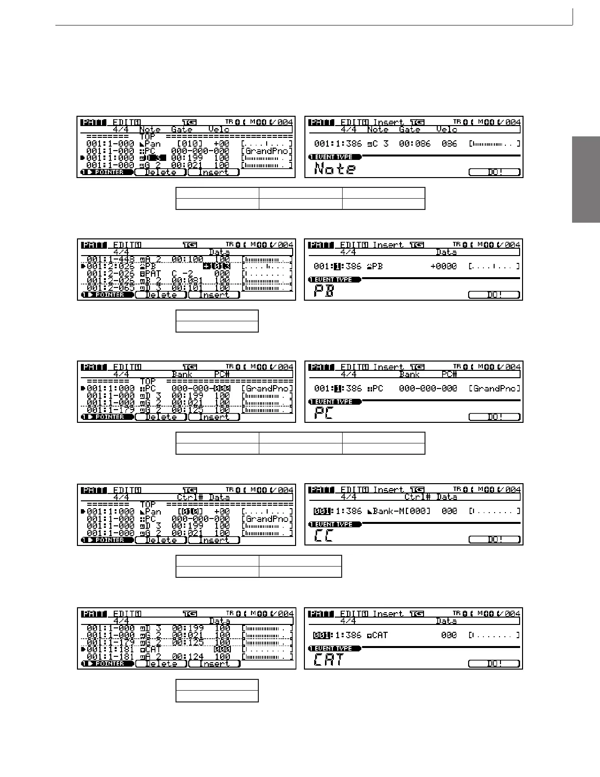 The parameters and value ranges for editable items are listed below. For each type of event the main edit display is shown on