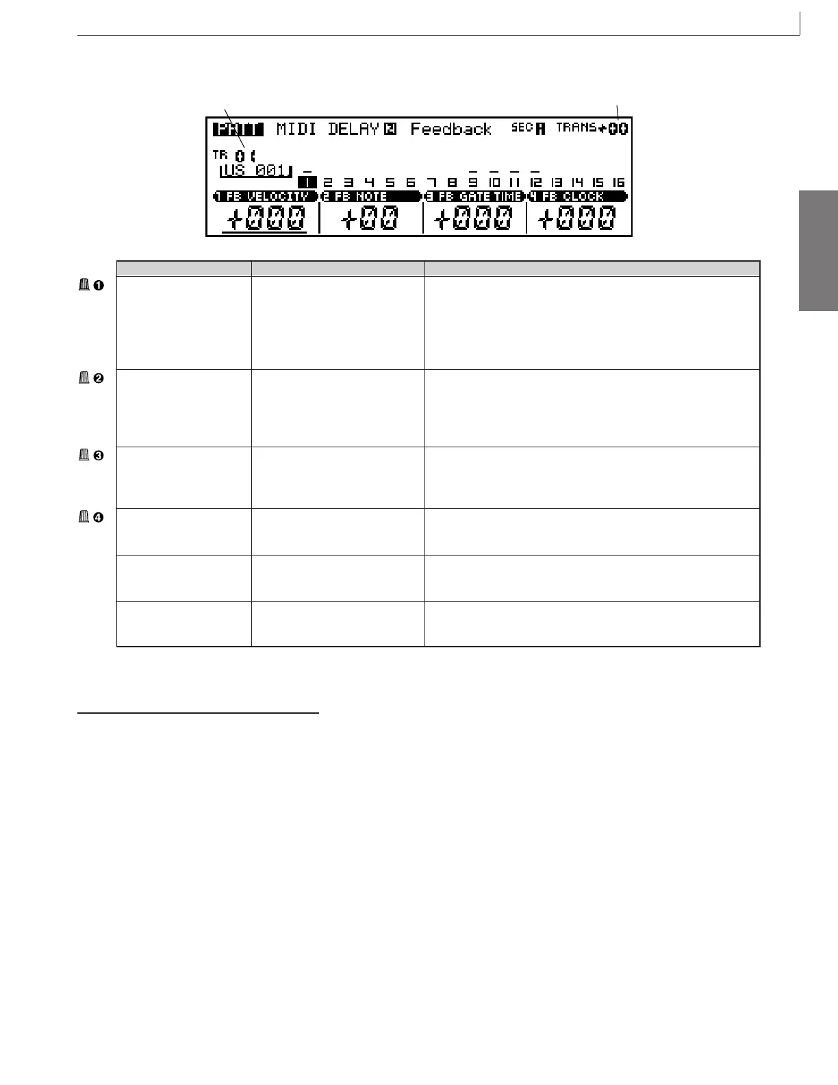 Feedback velocity -127 ... 000 ... +127 Offsets the velocity of the delayed notes, thereby affecting the level