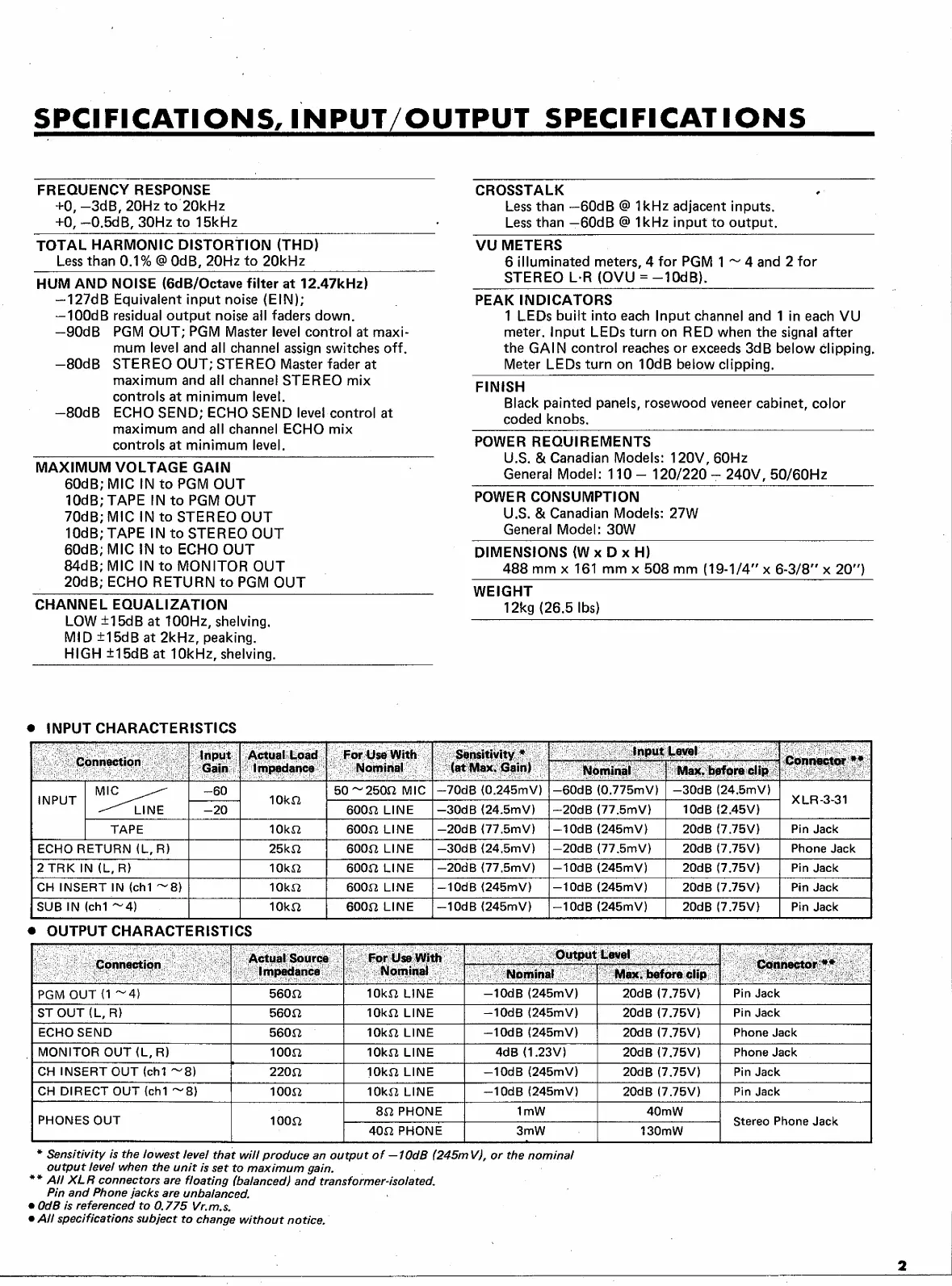 Yamaha RM804 - Yamaha RM804 Technical Specifications; Performance Specifications; Input and Output Characteristics