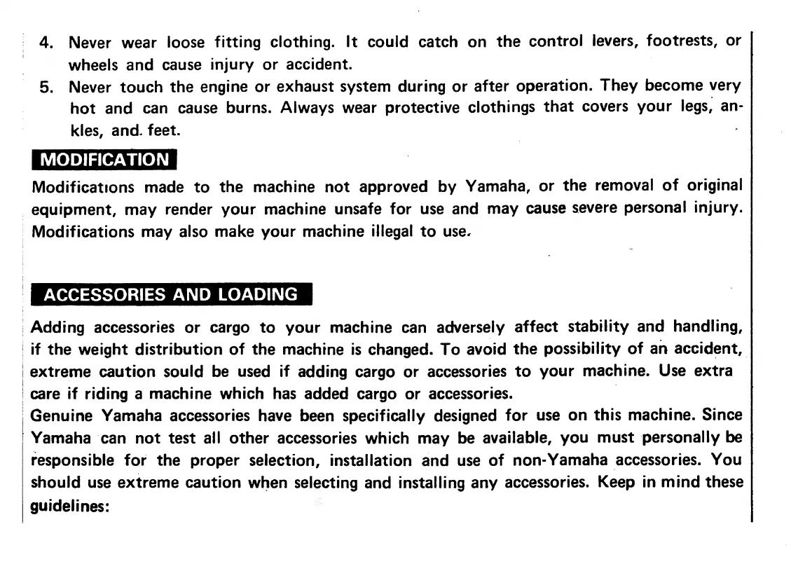 Yamaha RT180K - Clothing and Modification Safety; Accessories and Loading Safety