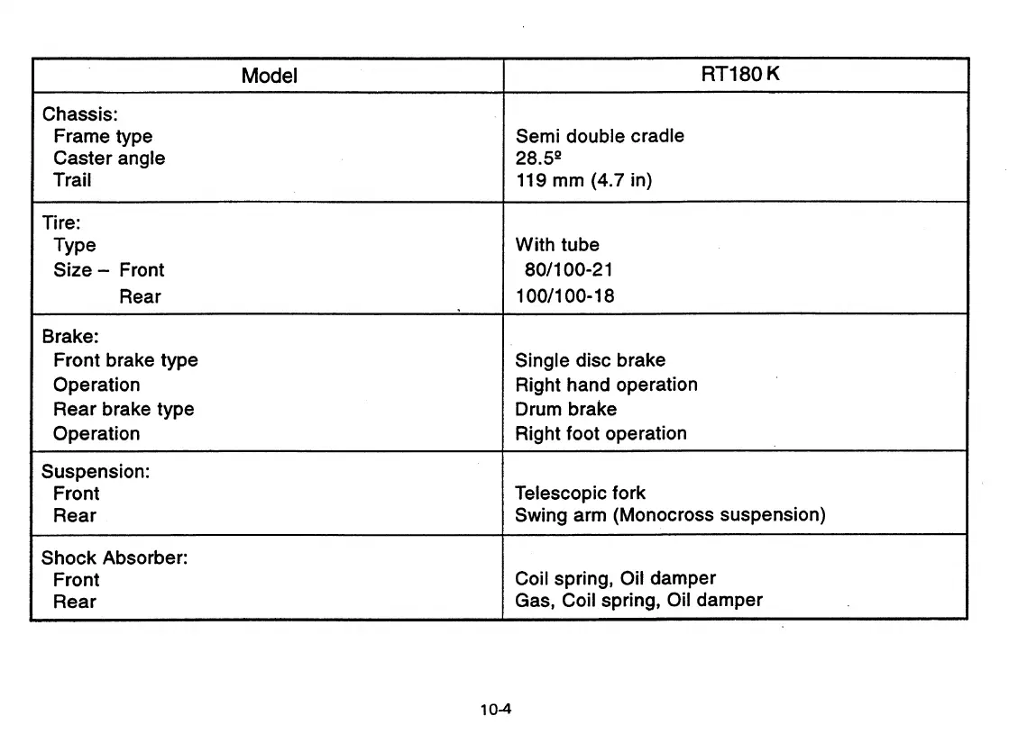 Yamaha RT180K - Chassis and Tire Specifications; Brake and Suspension Specifications