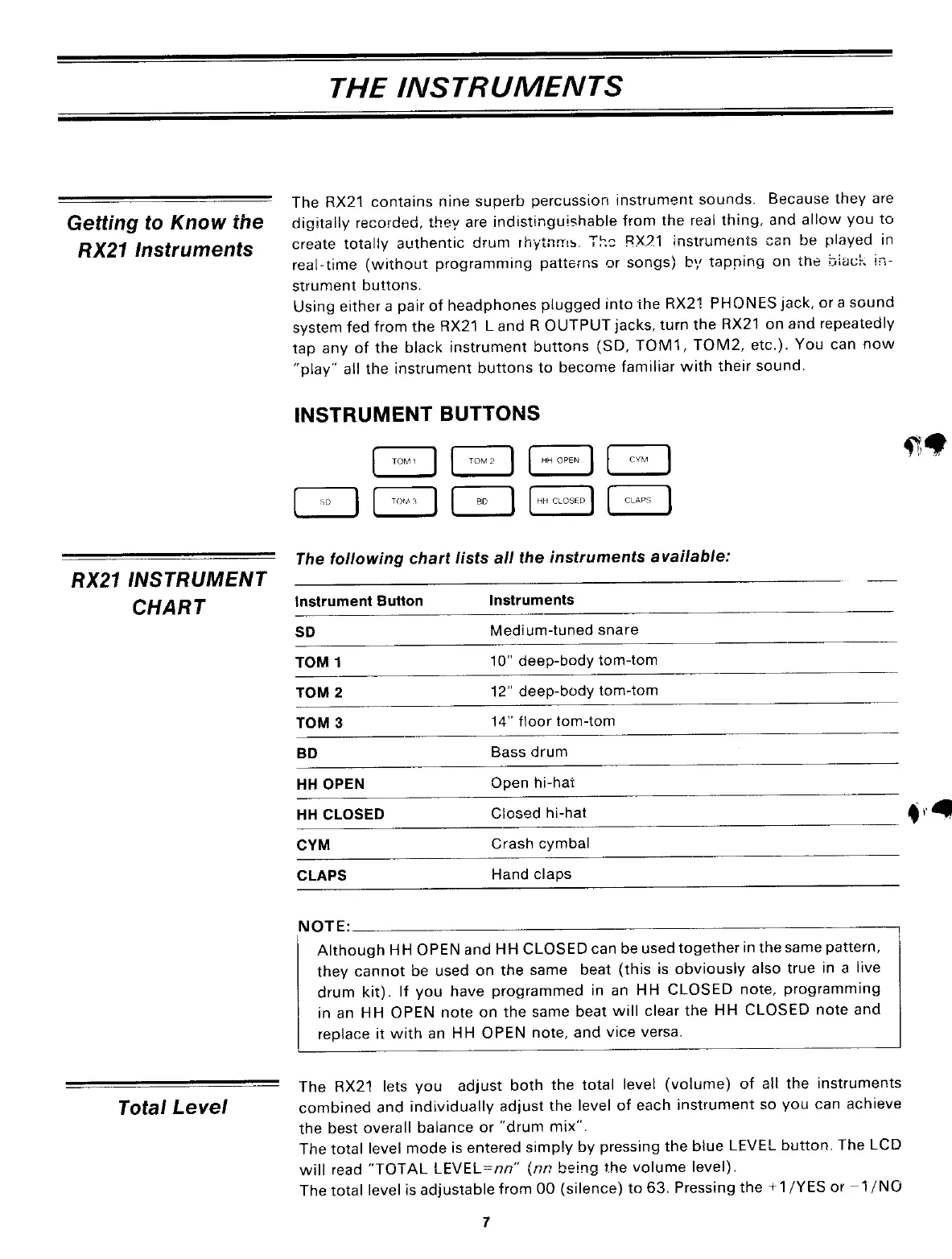Yamaha RX-21 - The Instruments; Getting to Know the RX21 Instruments; RX21 Instrument Chart; Total Level