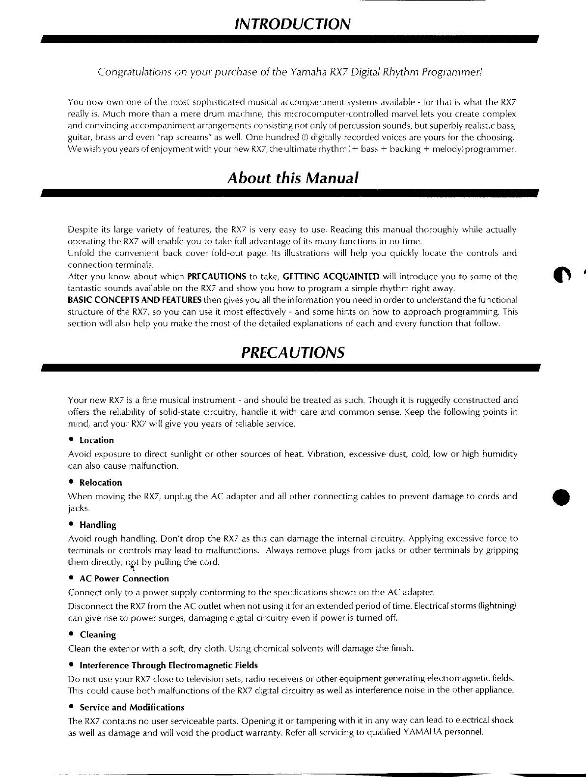 Yamaha RX-7 - Introduction to the RX7 Rhythm Programmer; About This Manual; Important Precautions for Operation