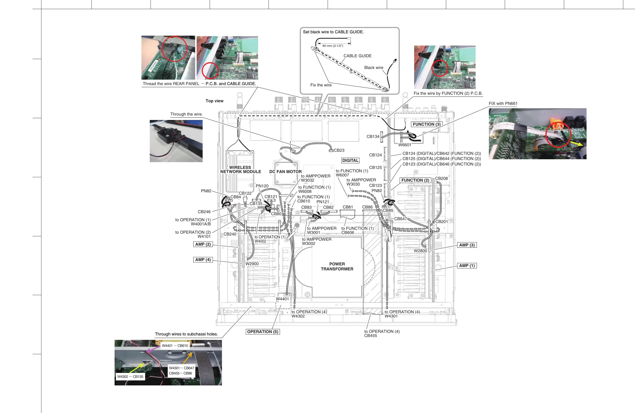 P.C.B. and CABLE GUIDE.Thread the wire REAR PANEL - P.C.B. and CABLE GUIDE.