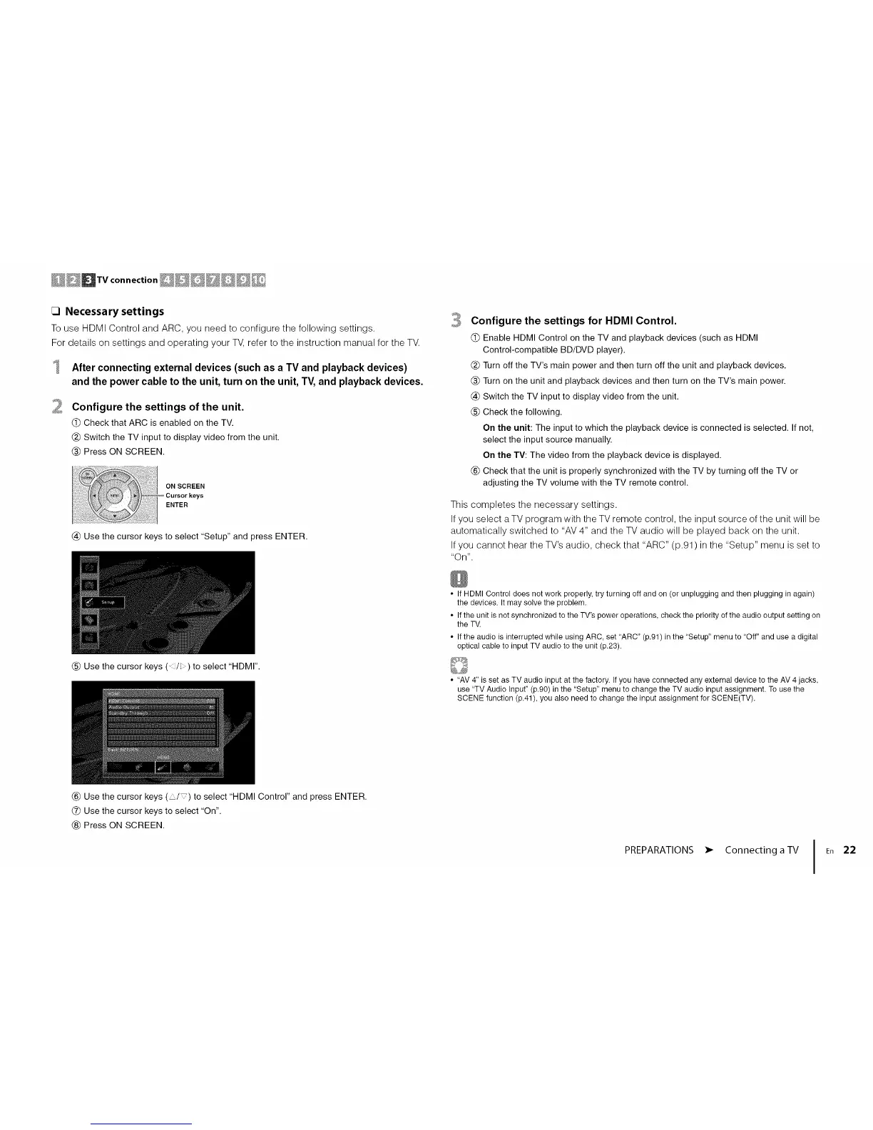 To use HDMI Control and ARC, you need to configure the following settings.