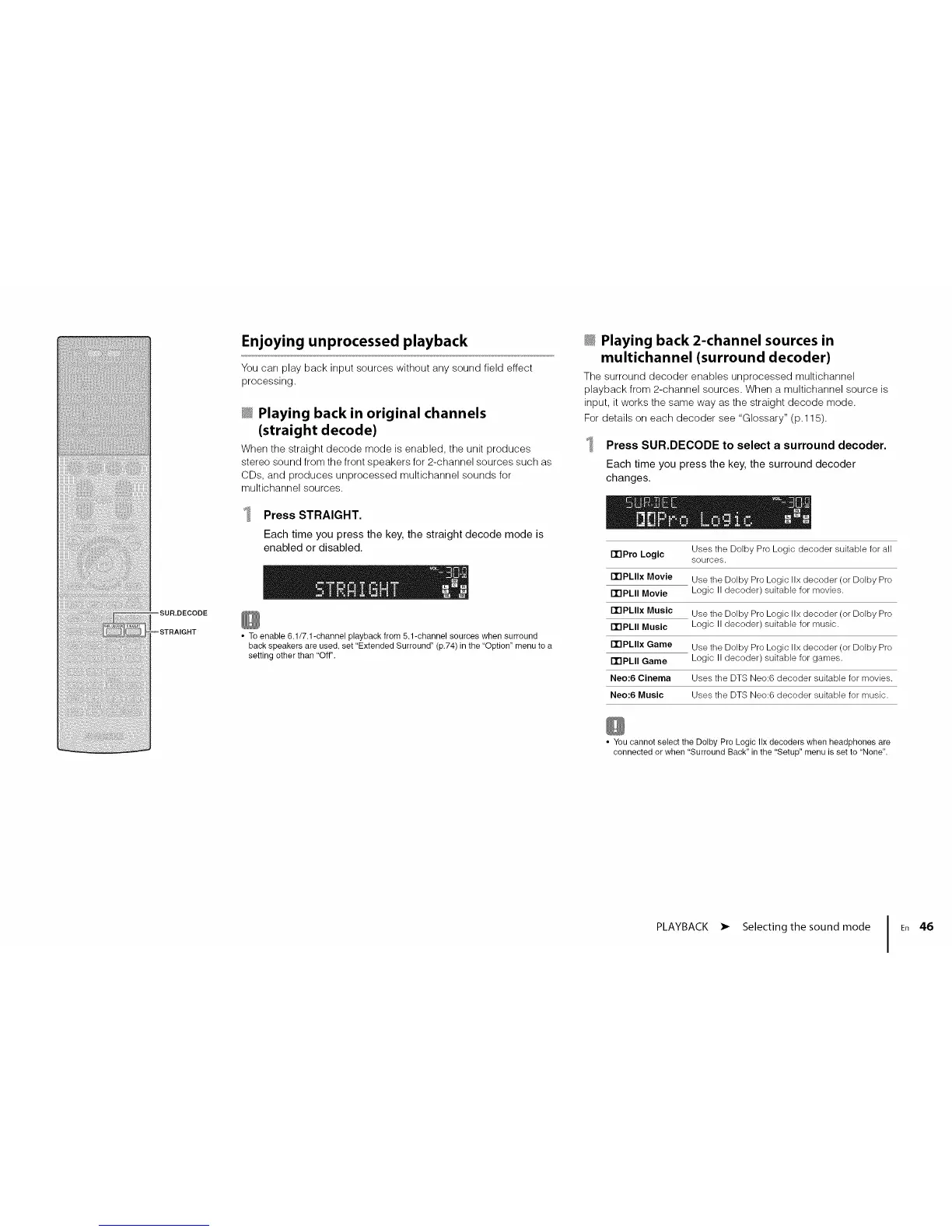 • You cannot select the Dolby Pro Logic IIx decoders when headphones are