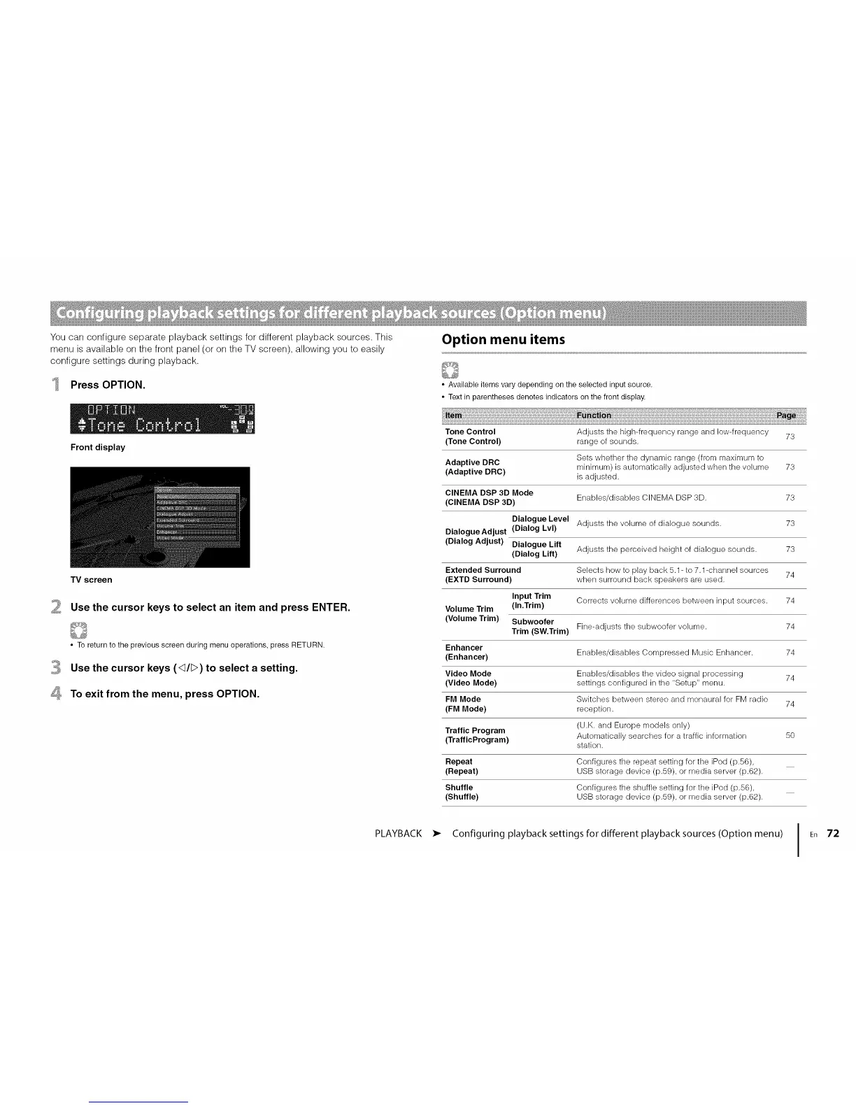 PLAYBACK • Configuring playback settings for different playback sources (Option menu) I En 72